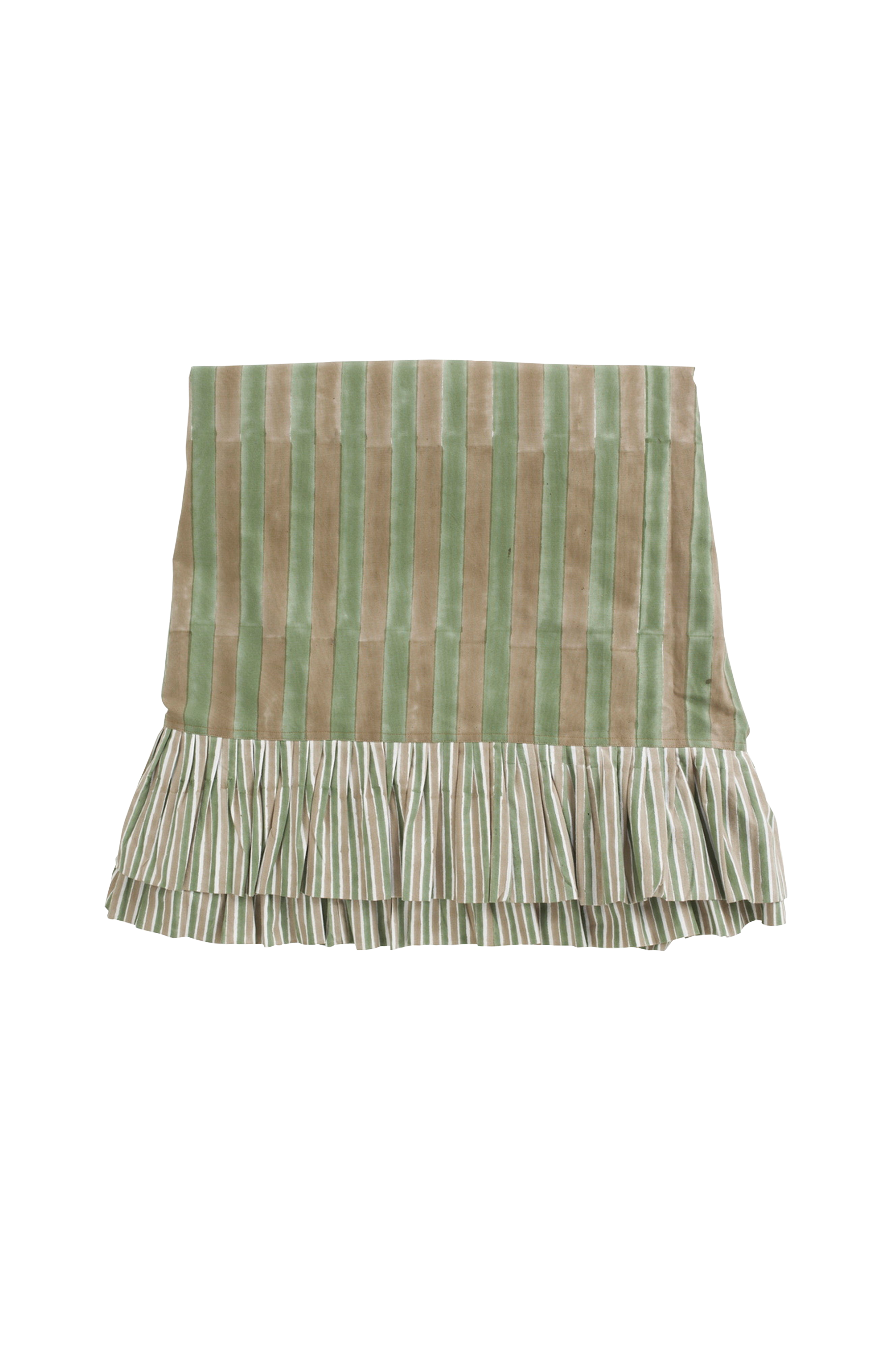 En opsigtsvækkende dug i bomuld af høj kvalitet med et bredt stripe mønster og en dekorativ dobbeltfoldet flæse langs kanten. Mønsteret er trykt i hånden ved hjælp af traditionelle indiske bloktrykteknikker. Et unikt håndværk, der giver hvert tekstil et unikt og dekorativt udtryk. Vaskes på et kort (maks. 1 time) og skånsomt program for uld/silke med mildt vaskemiddel.