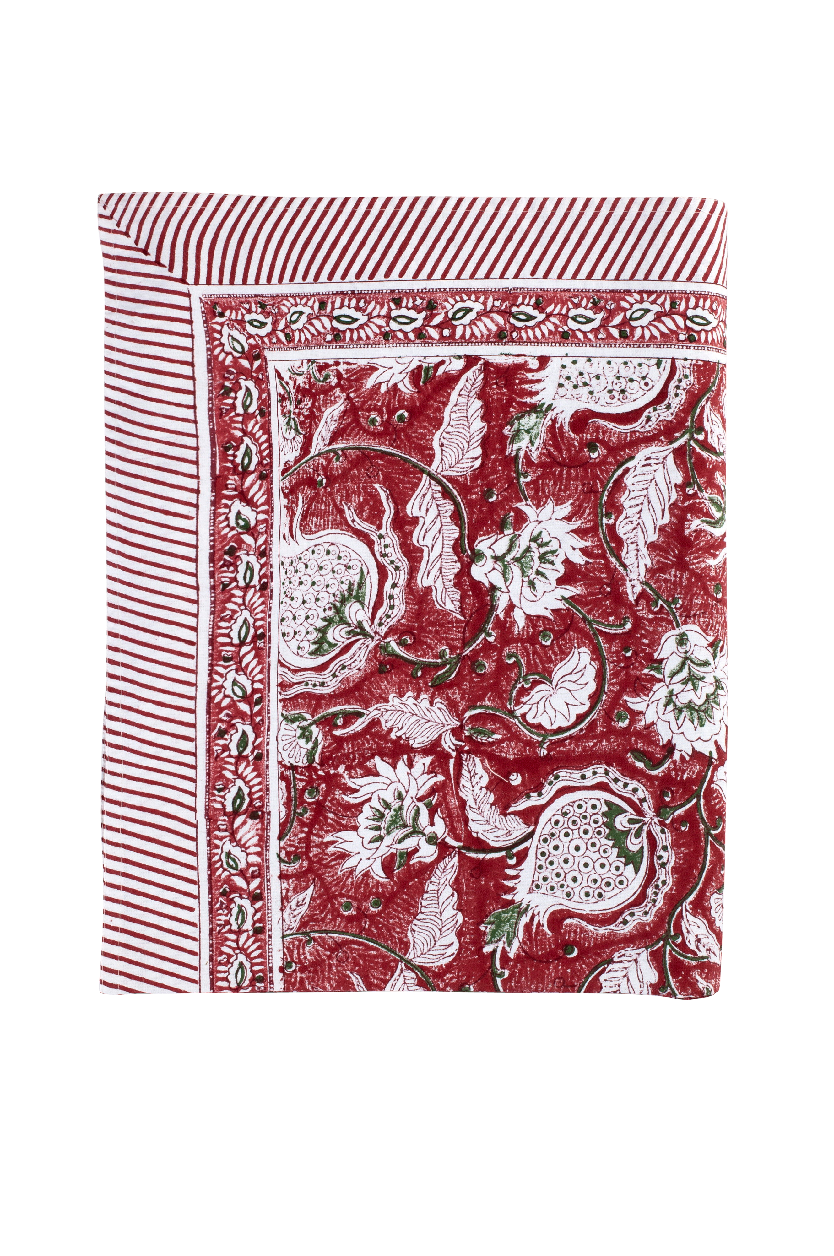 Dekorativ dug i bomuld af høj kvalitet med et smukt mønster af hvirvlende stængler, blade og granatæbler. Mønsteret er trykt i hånden ved hjælp af traditionelle indiske bloktrykteknikker. Et traditionelt håndværk, der giver hvert pudebetræk et unikt og dekorativt udtryk. Dette pudebetræk leveres uden inderpude. Vask forsigtigt på et kort (maks. 1 time) og skånsomt program for uld/silke med mildt vaskemiddel.