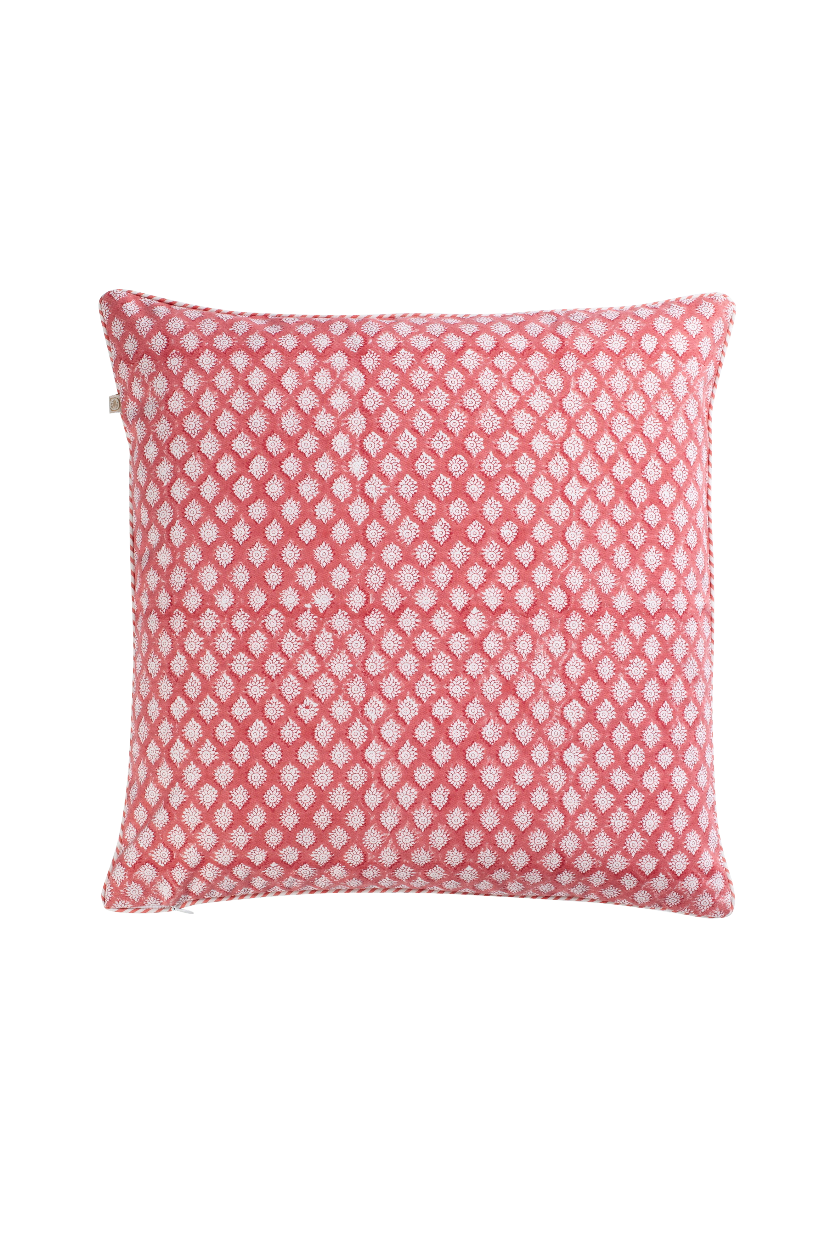 Pudebetræk i bomuld med smukt mønster. Mønstret er trykt i hånden i traditionel indisk blokprintteknik. Et unikt håndværk som giver stoffet et levende og dekorativt udtryk. Vaskes på 30 grader uld/silke-program med mildt flydende vaskemiddel uden blegemiddel. Må ikke tørretumbles. Kan stryges varmt.