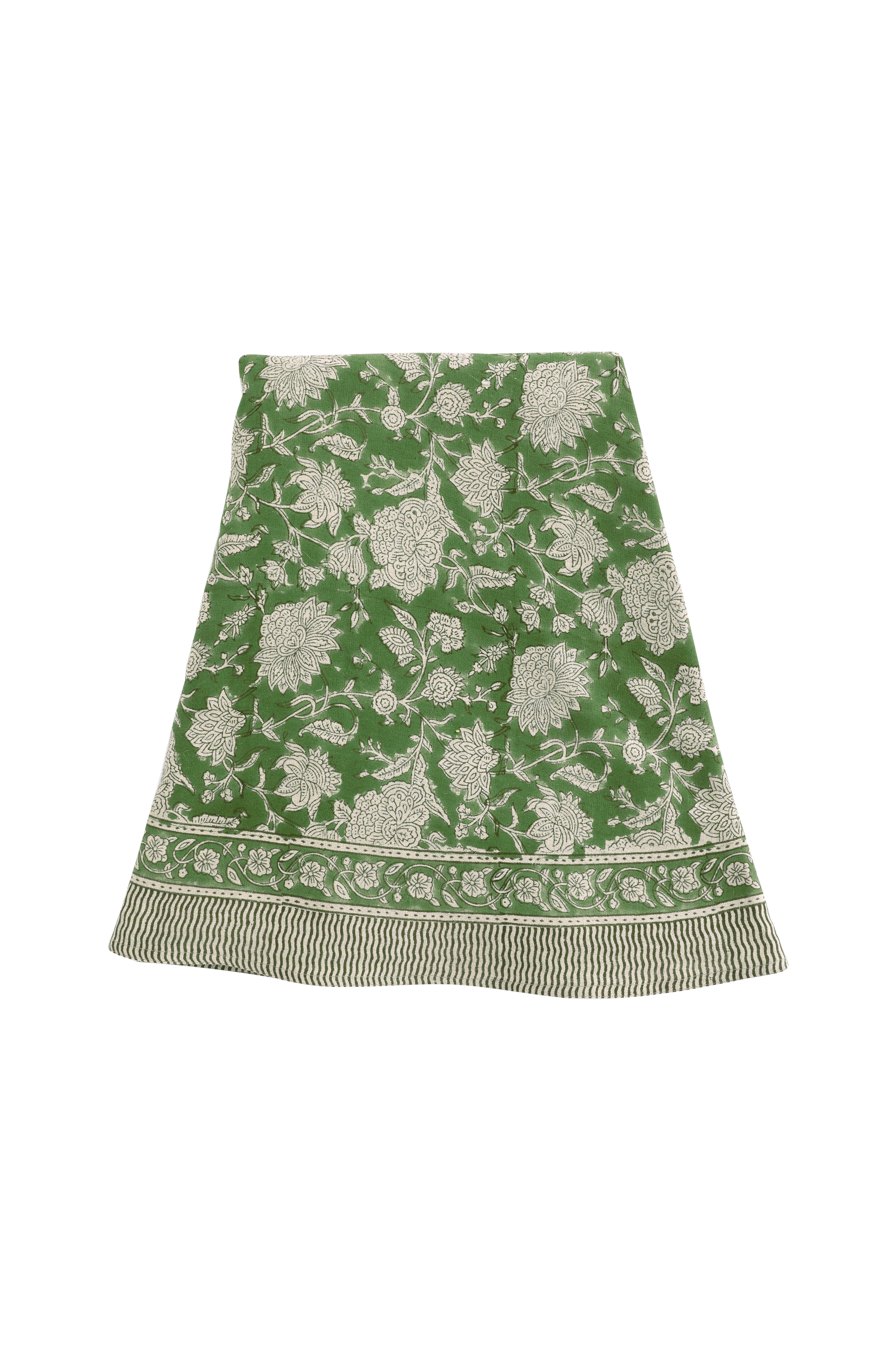 En eksklusiv dug i kraftig hør med et smukt blomstermønster og en dekorativ kant. Mønsteret er trykt i hånden ved hjælp af traditionelle Indian bloktrykteknikker. Et unikt håndværk, der giver hver dug et unikt og dekorativt udtryk. Vask din dug på et kort (maks. 1 time) og skånsomt program for uld/silke med mildt vaskemiddel.