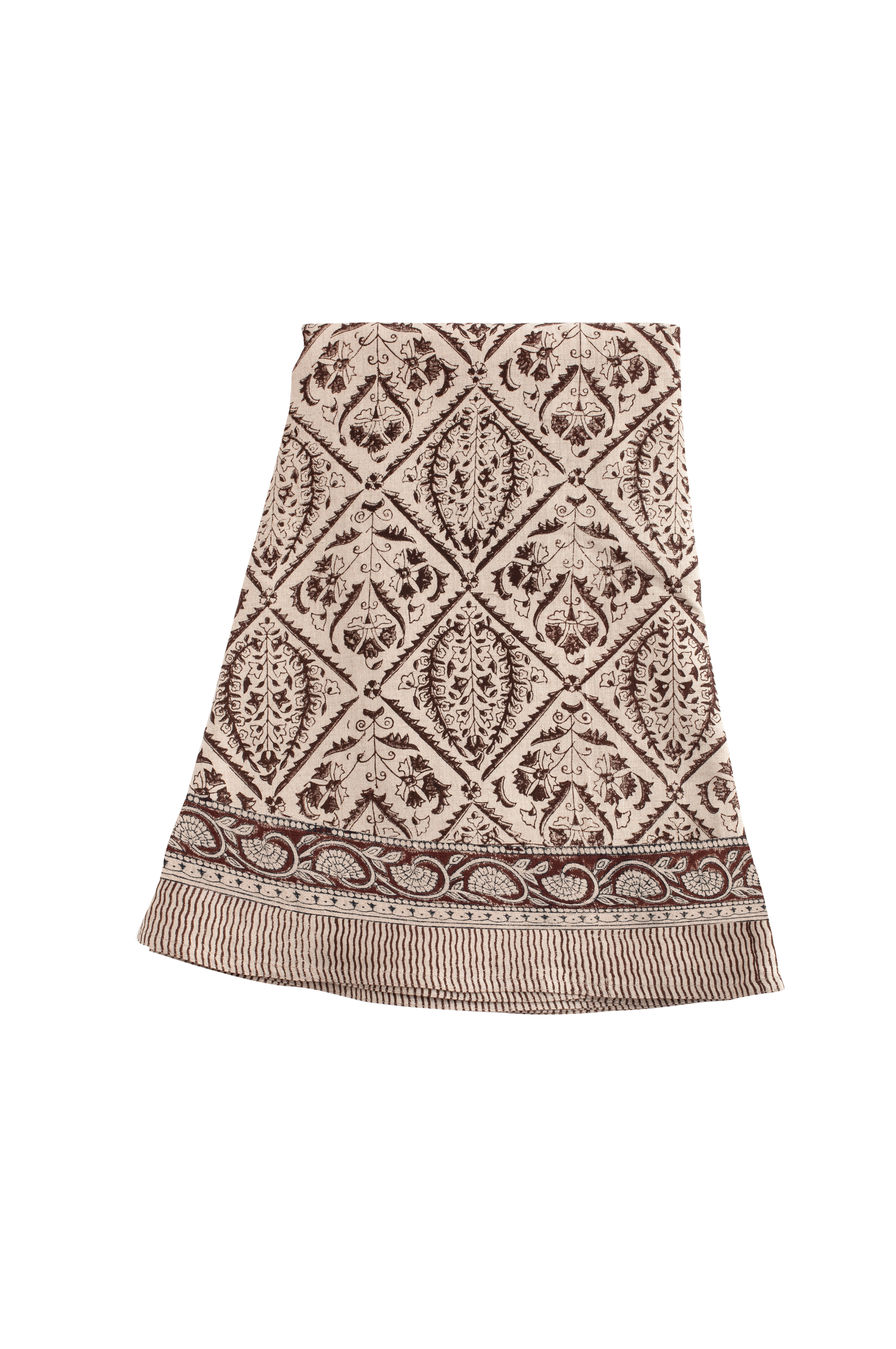 En eksklusiv rund dug i kraftig hør med et smukt blomstermønster og en dekorativ kant. Mønsteret er trykt i hånden ved hjælp af traditionelle indiske bloktrykteknikker. Et unikt håndværk, der giver hver dug et unikt og dekorativt udtryk. Vask din dug på et kort (maks. 1 time) og skånsomt program for uld/silke med mildt vaskemiddel.