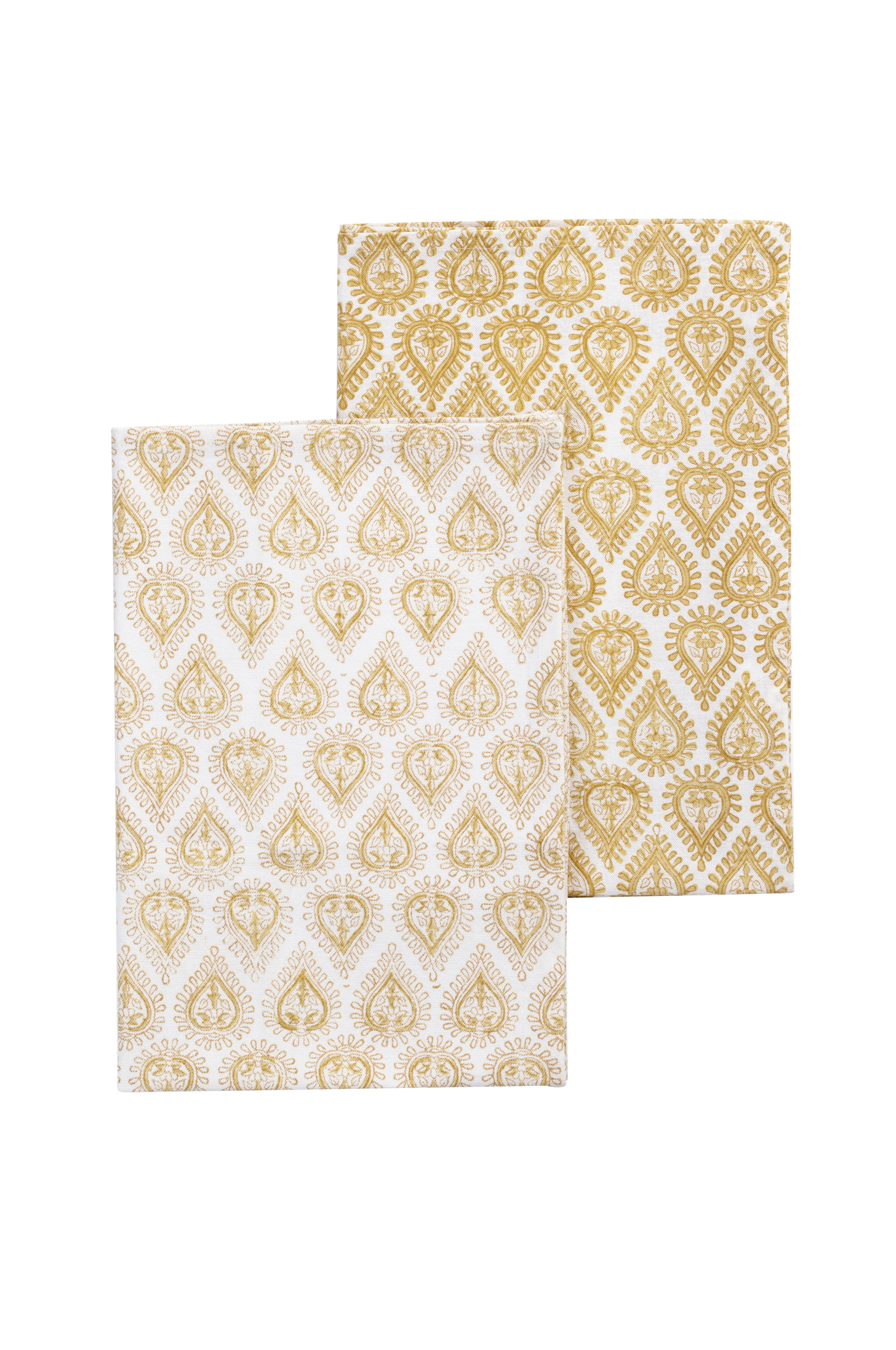 To viskestykker af bomuld med forskellige mønstre i samme farve. Mønstrene er trykt i hånden i traditionel indisk blokprintteknik. En urgammel teknik som giver tekstilerne et levende og dekorativt udtryk. Vaskes på 30 grader uld/silke-program med mildt flydende vaskemiddel uden blegemiddel. Må ikke tørretumbles. Kan stryges varmt.