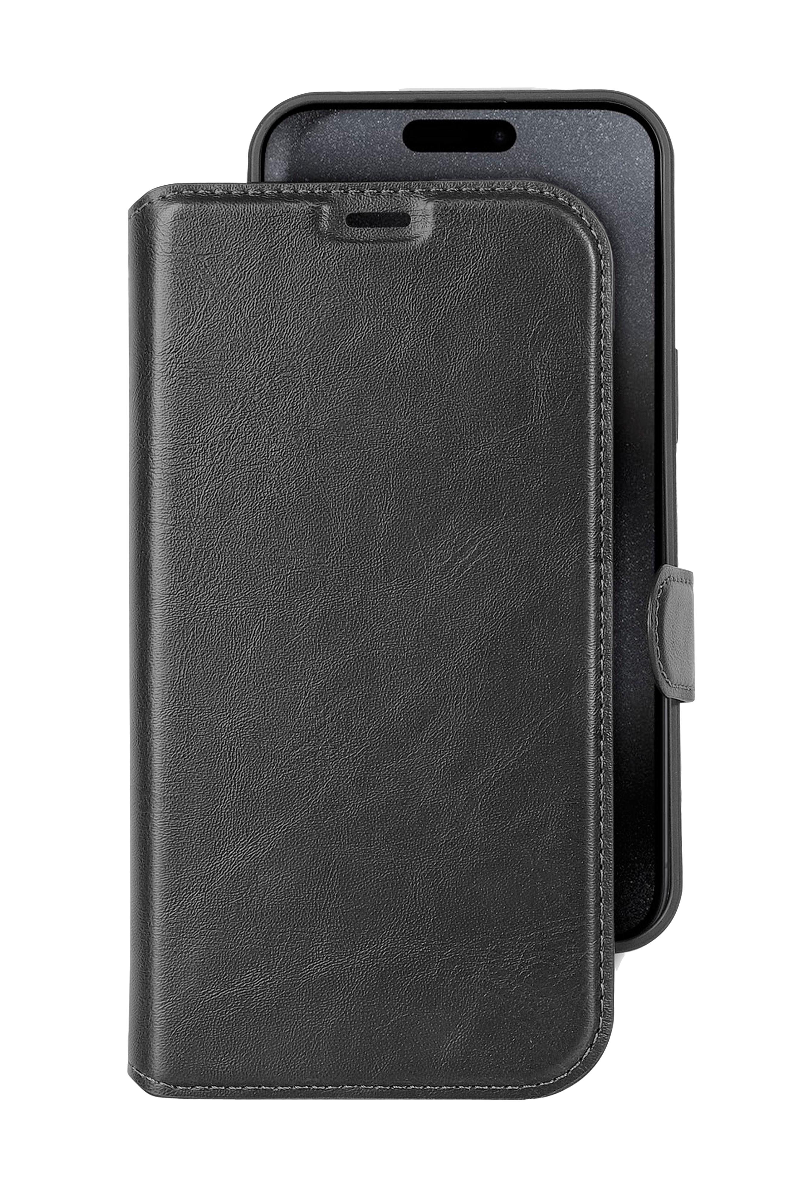 Mobilcover med tegnebog i slidstærkt kunstlæder til iPhone 15 Pro.