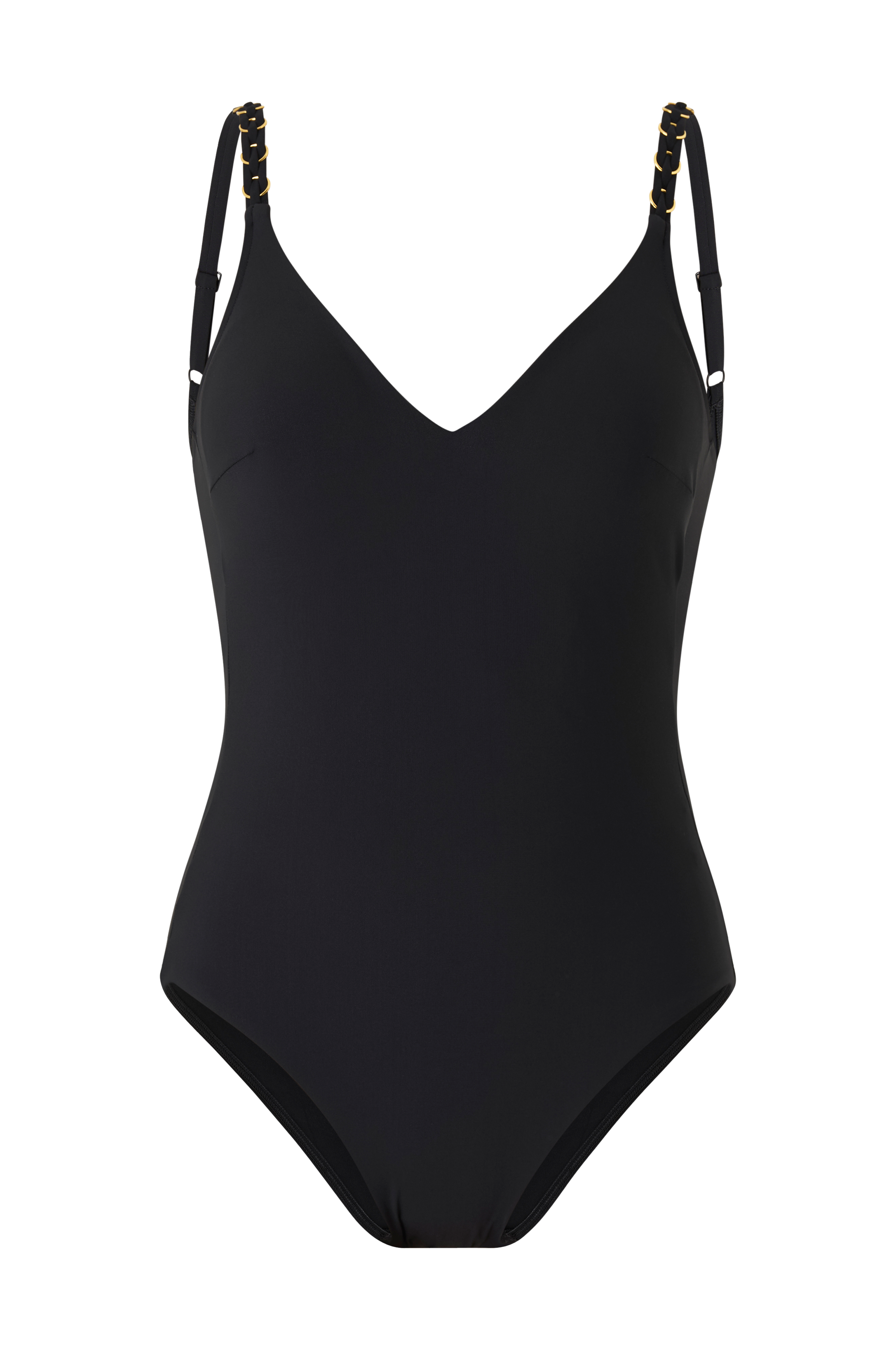• V-udskæring• Tynd polstring• Justérbare skulderstropper med guldfarvede detaljer• For foran