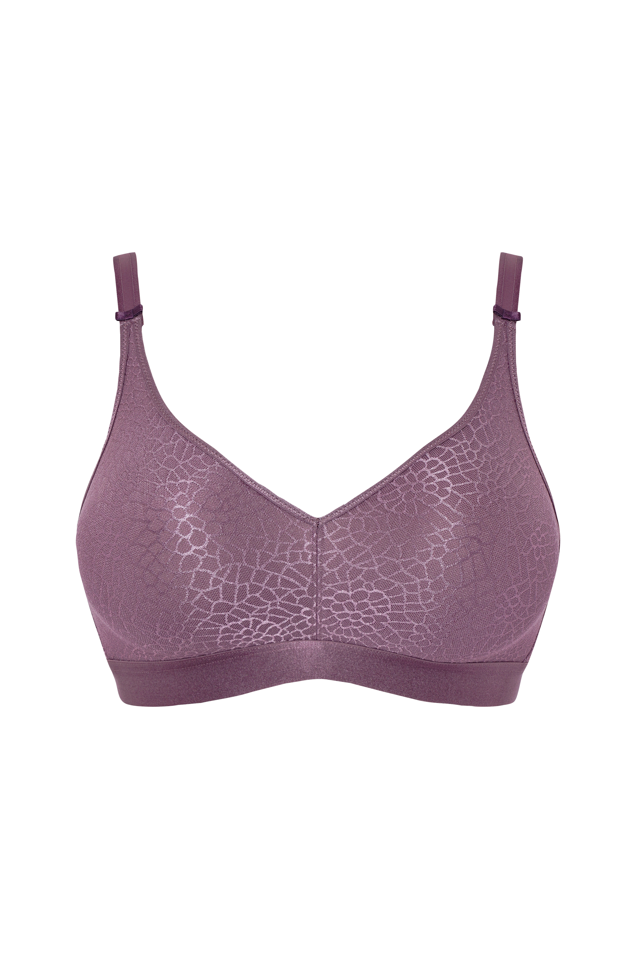 Blød bh uden bøjler med v-udskæring foran og bred elastik forneden. Giver god støtte og komfort. I meshjersey med blondemønster. Justerbare skulderstropper og justerbar hægte- og mallelukning i ryggen. Foret.