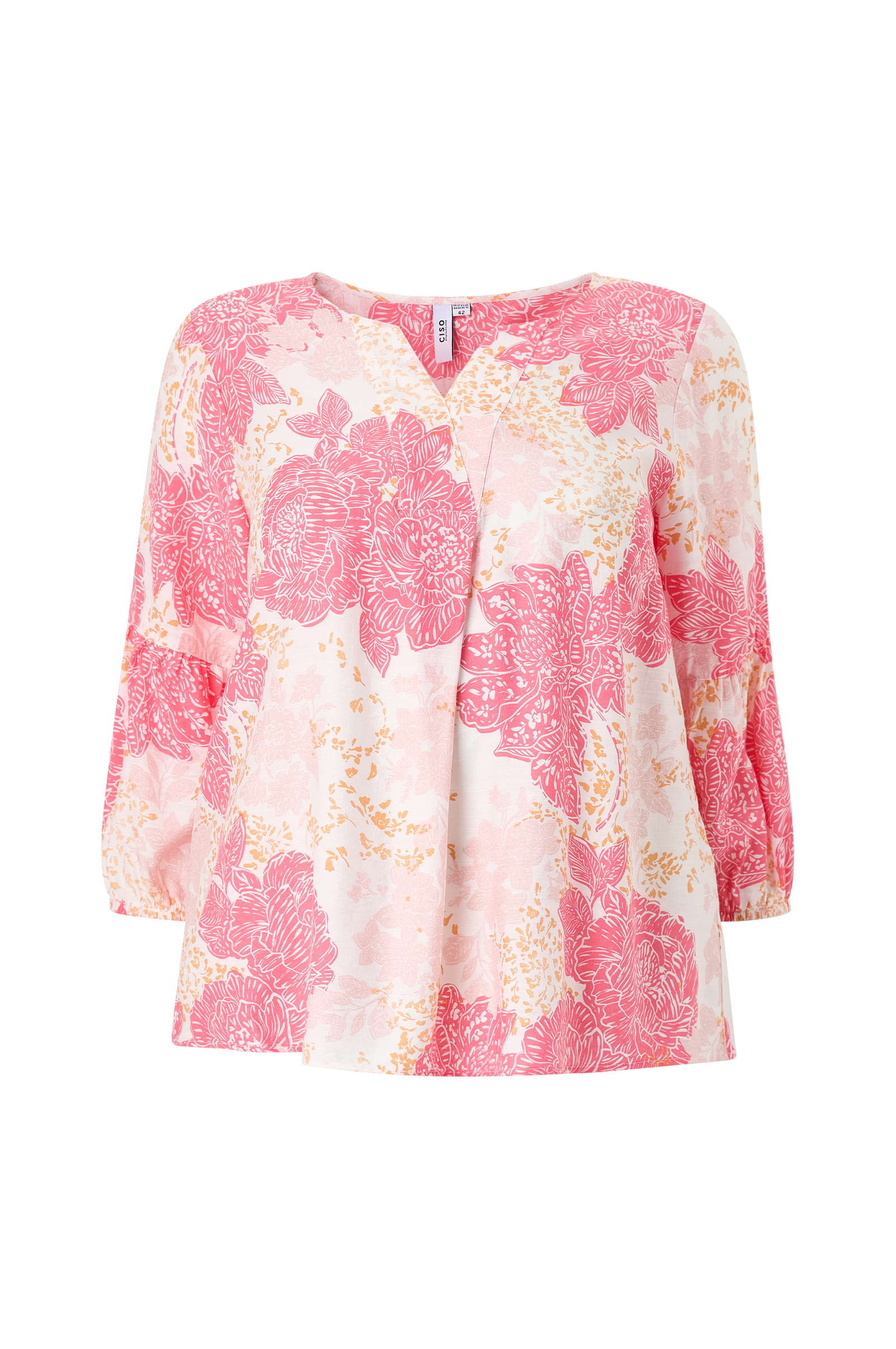 • Bluse med løs pasform• Rund halsudskæring med v-formet udskåret detalje• 3/4 lange ærmer med rynket søm ved albuerne og elastiske ærmeafslutninger• Bølgeformet detalje oppe foran• Plusstørrelser