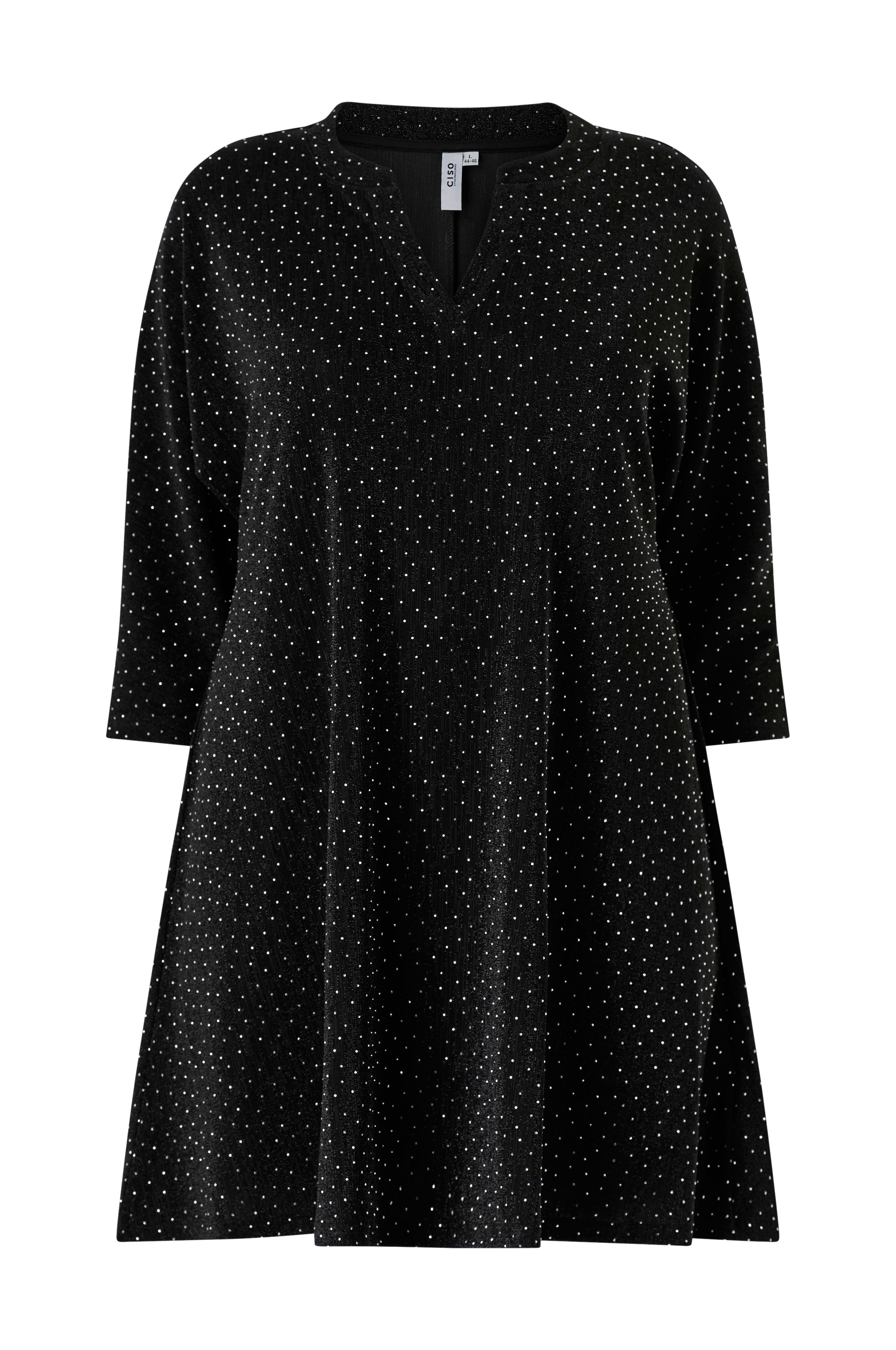 • Elastisk, A-facon tunika med glimmertråd og rhinstene• Rund halsudskæring med slids• 3/4 lange ærmer• Plusstørrelser• Længde: 97 cm i størrelse L