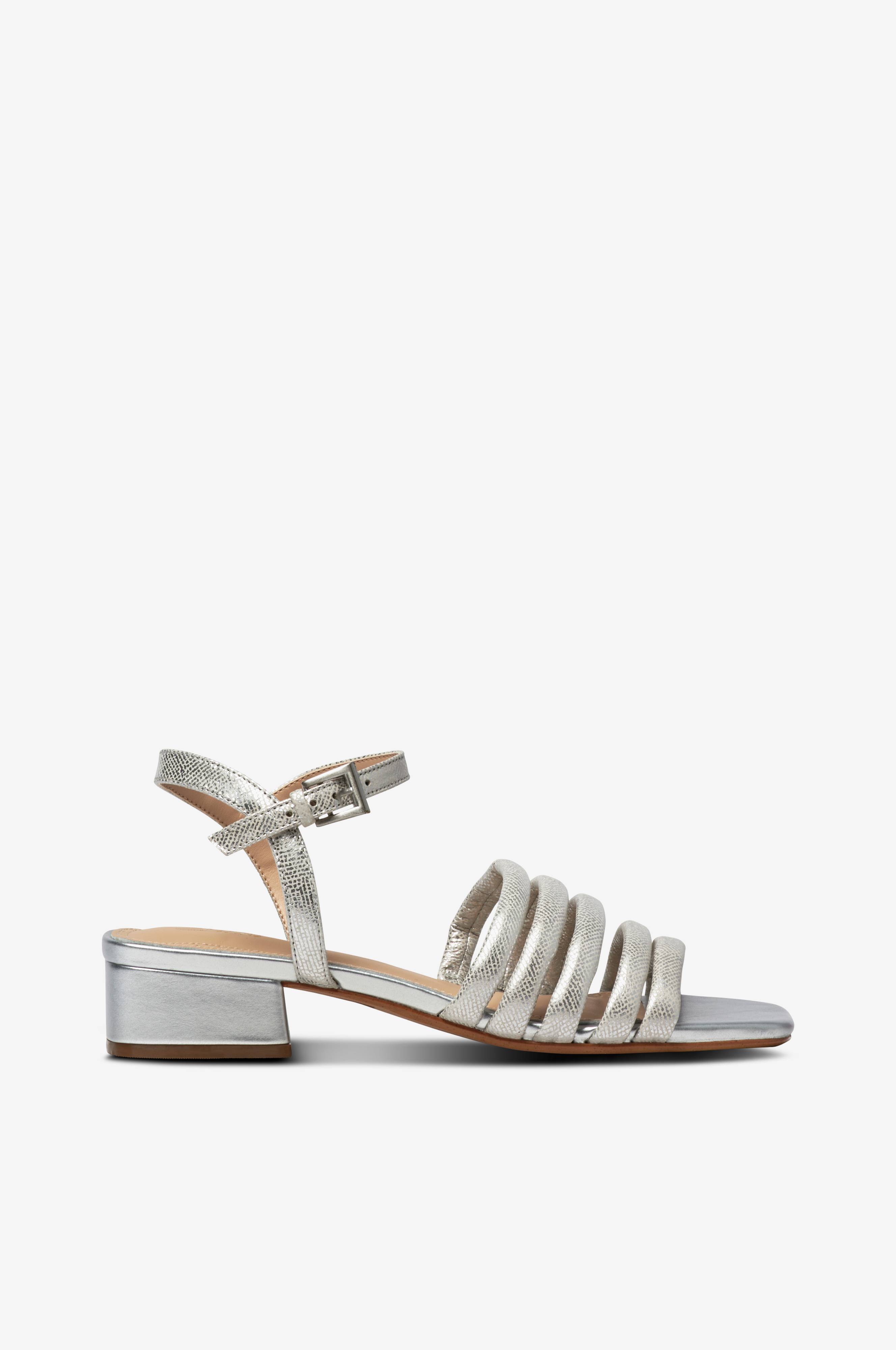 • Sølvfarvede remme i læder• Justérbar rem ved anklen• Hælhøjde: 3,5 cm