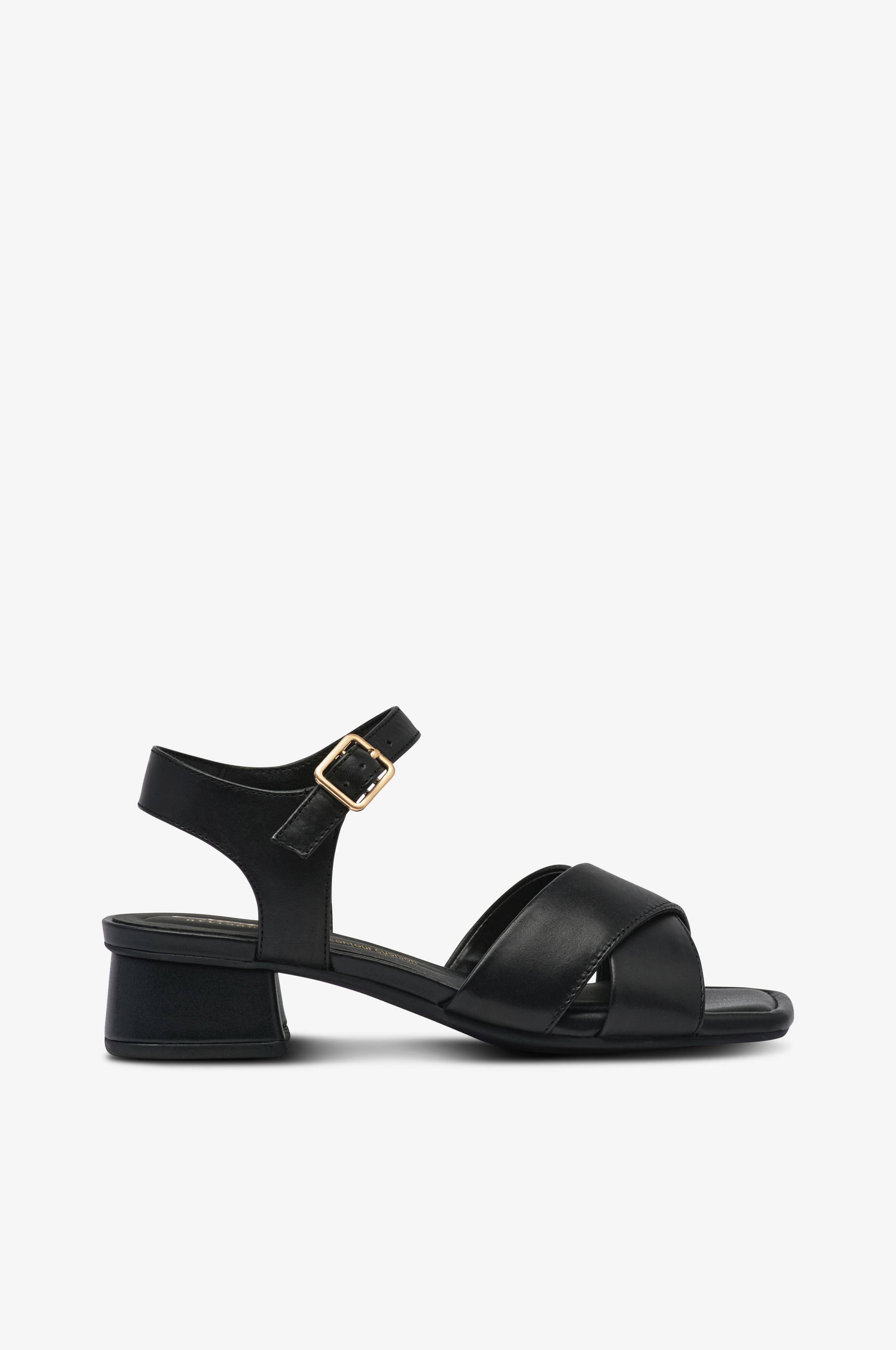 • Sandaler med hæl i læder• Krydsende remme foran• Justérbar rem ved anklen med metallukning• For i læder• Beklædt hæl• Blød polstret indersål• Hælhøjde: 3,5 cm