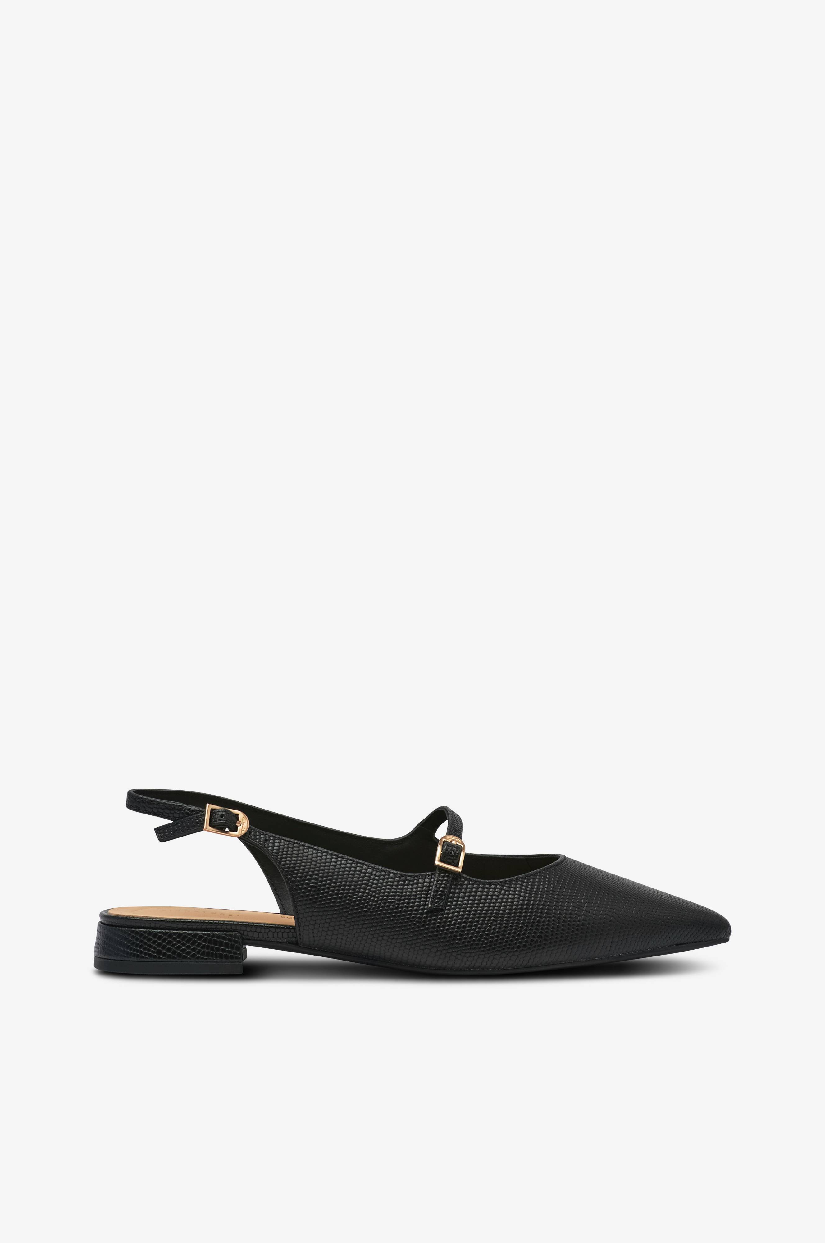 • Øvredel i læder med strukturmønster• Spids tåform• Smal rem over foden med metallukning• Justérbar hælrem med metallukning• For i læder• Lav hæl