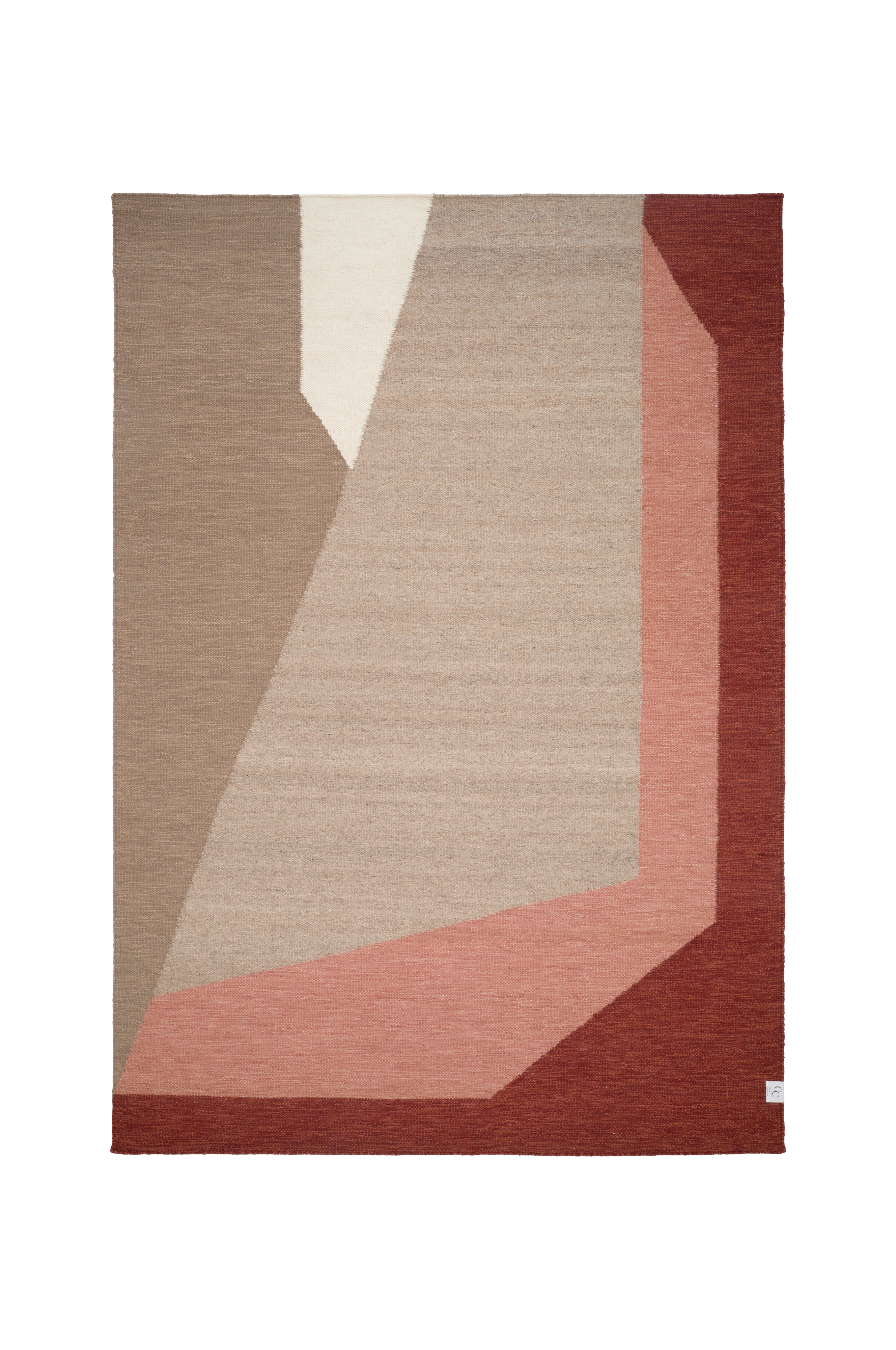 Fladvævet tæppe Levels er et design med tydelige felter og farver, lyse toner af beige møder dybere toner af pink og rød. Praktisk og robust vendbart tæppe.
