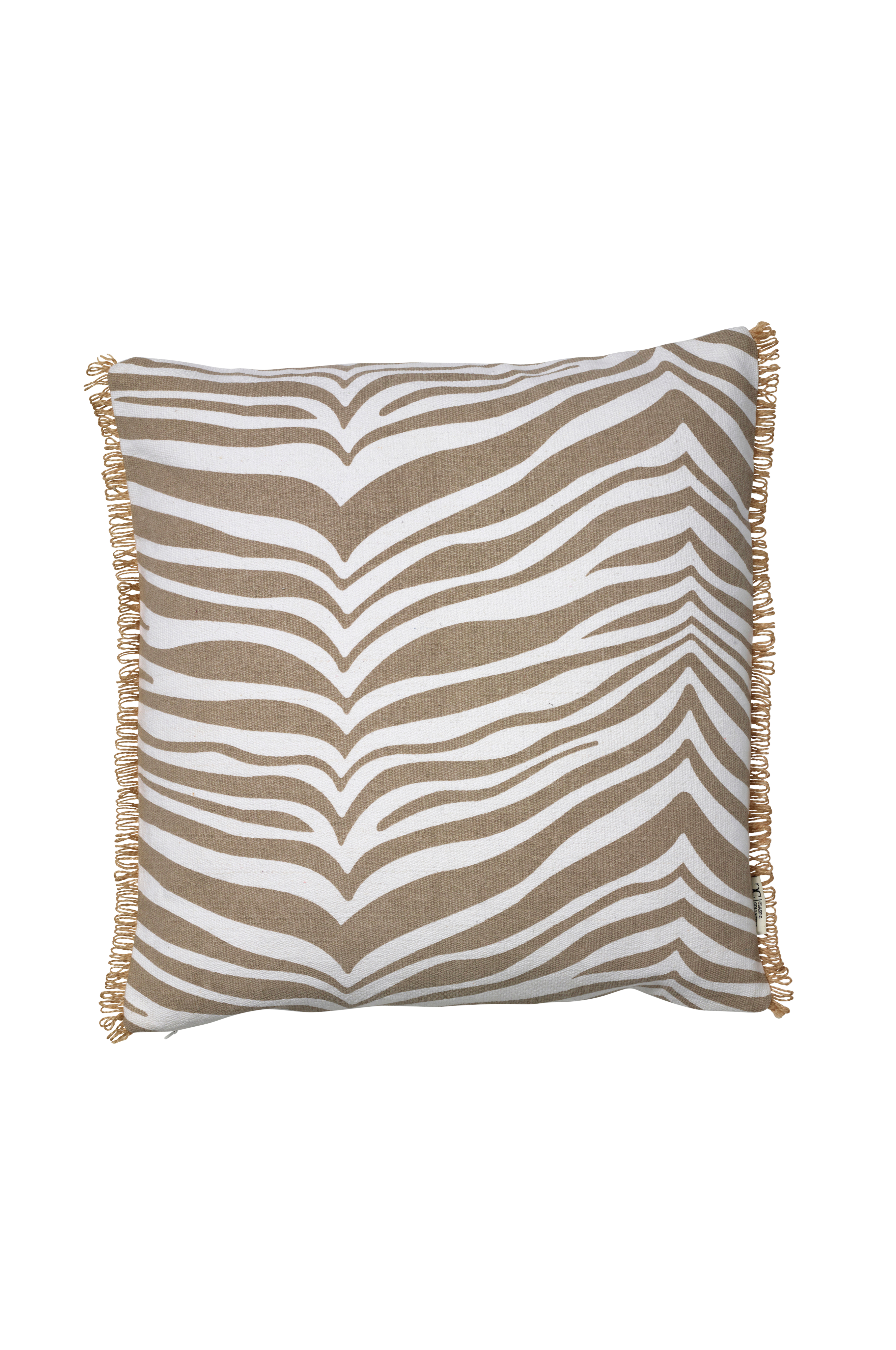 Pude Zebra er en klassisk zebramønstret pude i bomuld med en frynsekant. Puden er fremstillet i 100% bomuld og mønstret er håndtrykt på puden. Puden har en kant af jute, ensfarvet bagside og lynlås i siden. Størrelse 50x50.