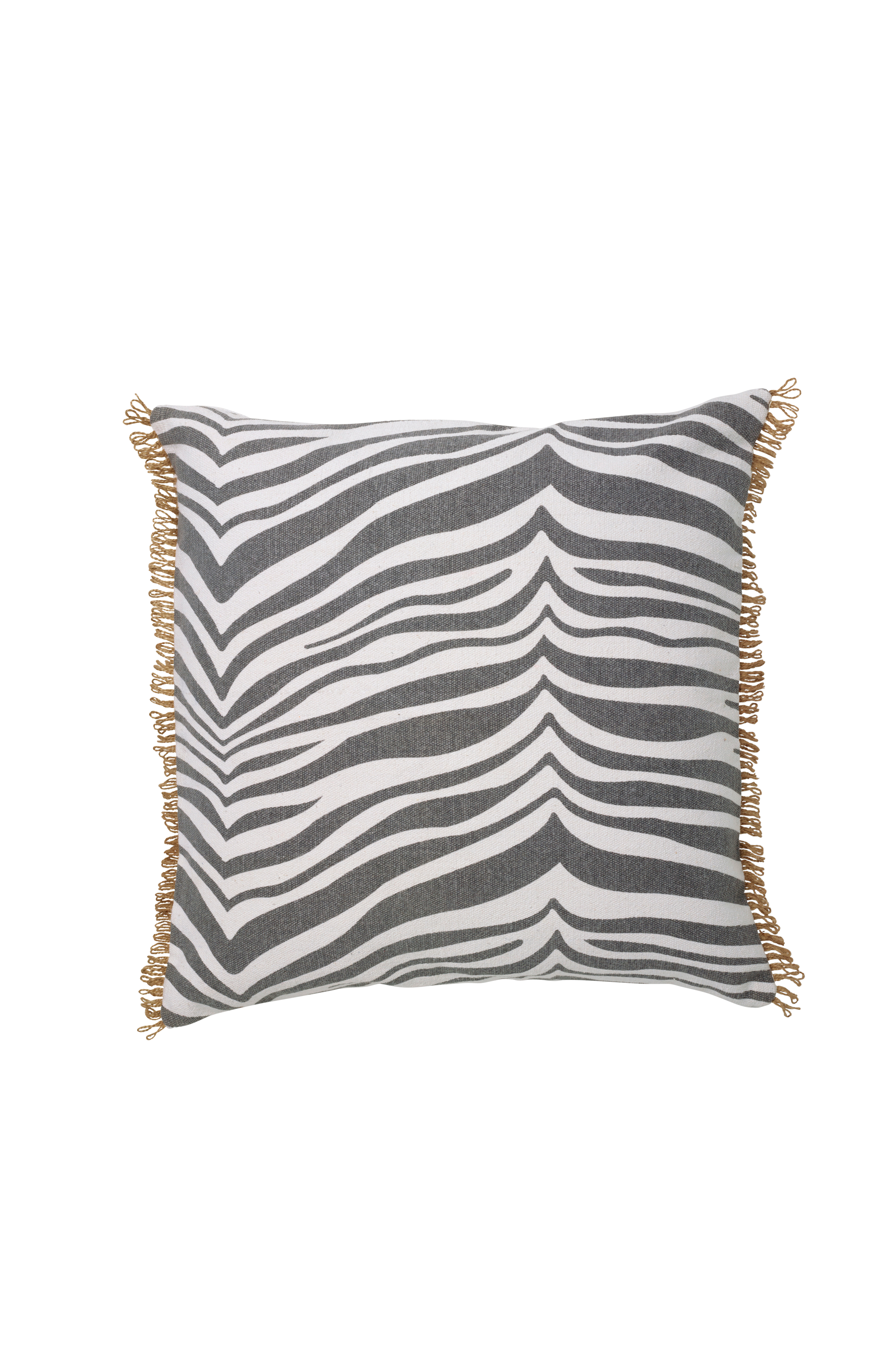 Pude Zebra er en klassisk zebramønstret pude i bomuld med en frynsekant. Puden er fremstillet i 100% bomuld og mønstret er håndtrykt på puden. Puden har en kant af jute, ensfarvet bagside og lynlås i siden. Størrelse 50x50.