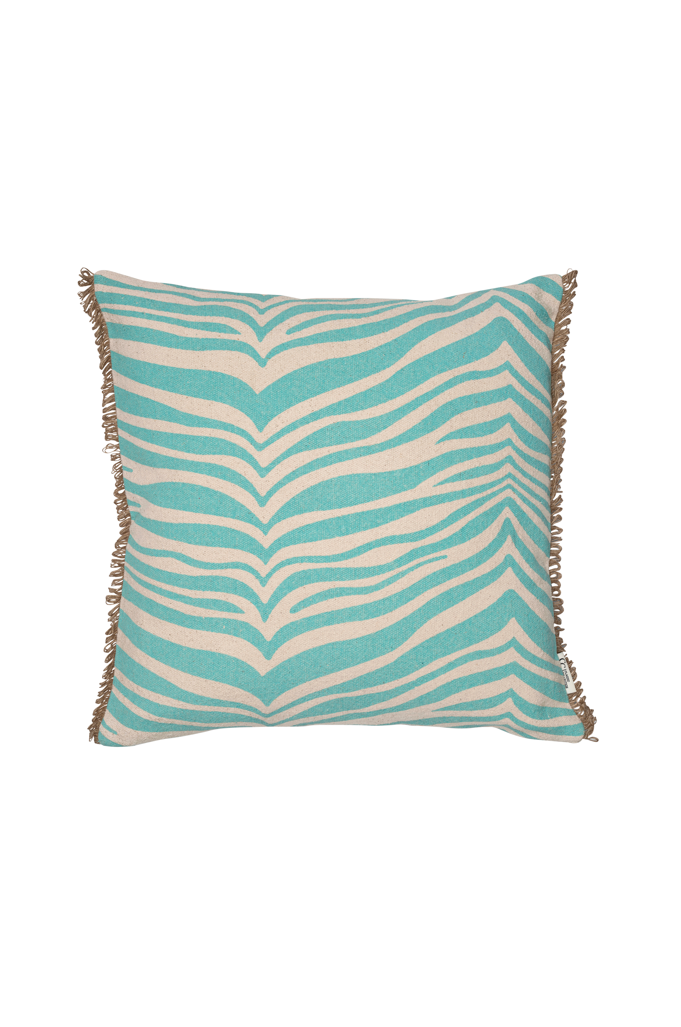 Pude Zebra er en klassisk zebramønstret pude i bomuld med en frynsekant. Puden er fremstillet i 100% bomuld og mønstret er håndtrykt på puden. Puden har en kant af jute, ensfarvet bagside og lynlås i siden. Størrelse 50x50.
