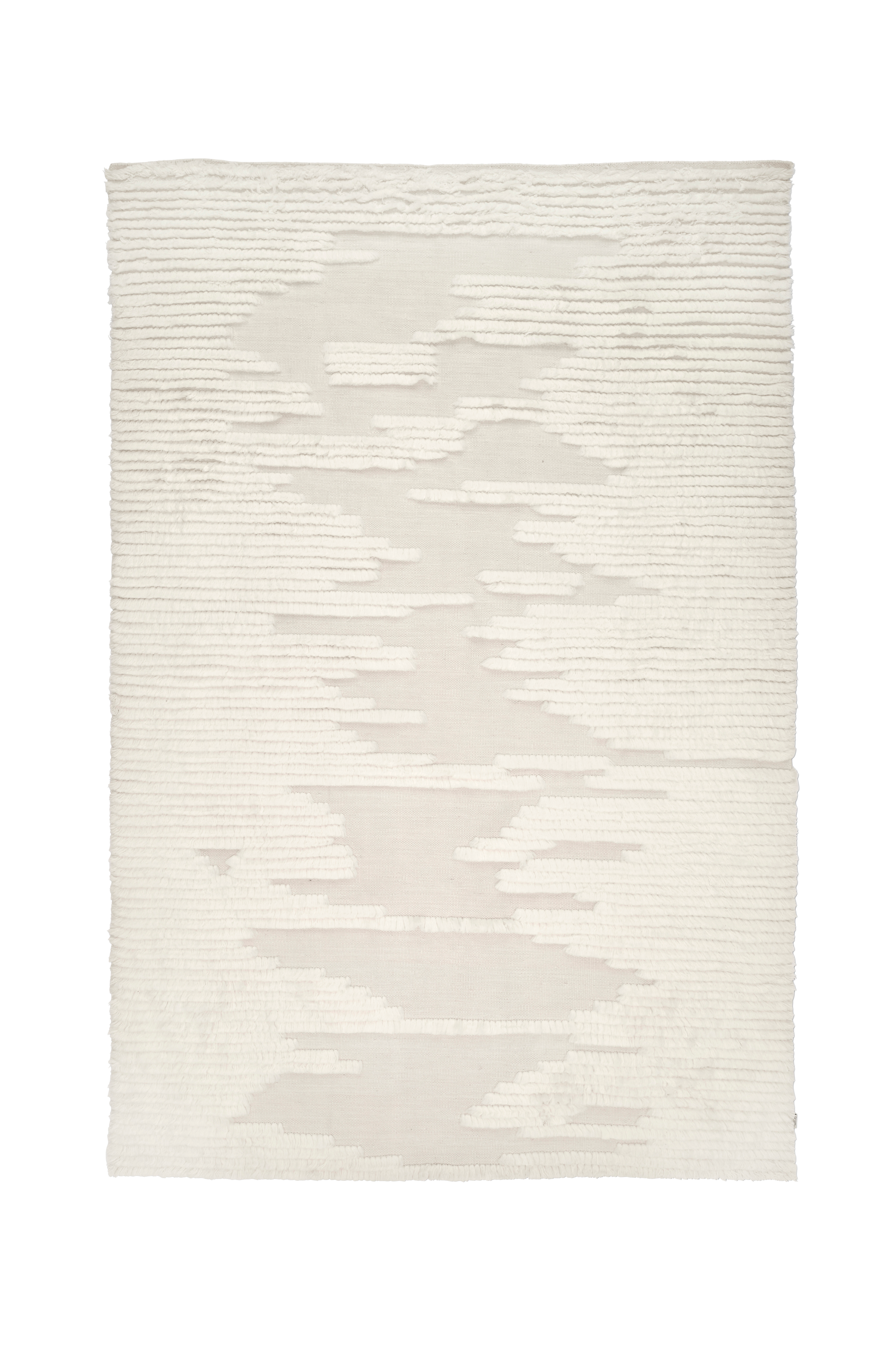 Uldtæppe Agadir er et håndvævet luvtæppe i naturlig, ufarvet uld. Det uregelmæssige mønster giver tæppet et skønt liv. Tæppet er fladvævet, men mønstret har længere luv, som giver tæppet et blødt udtryk og gør det skønt at gå på.