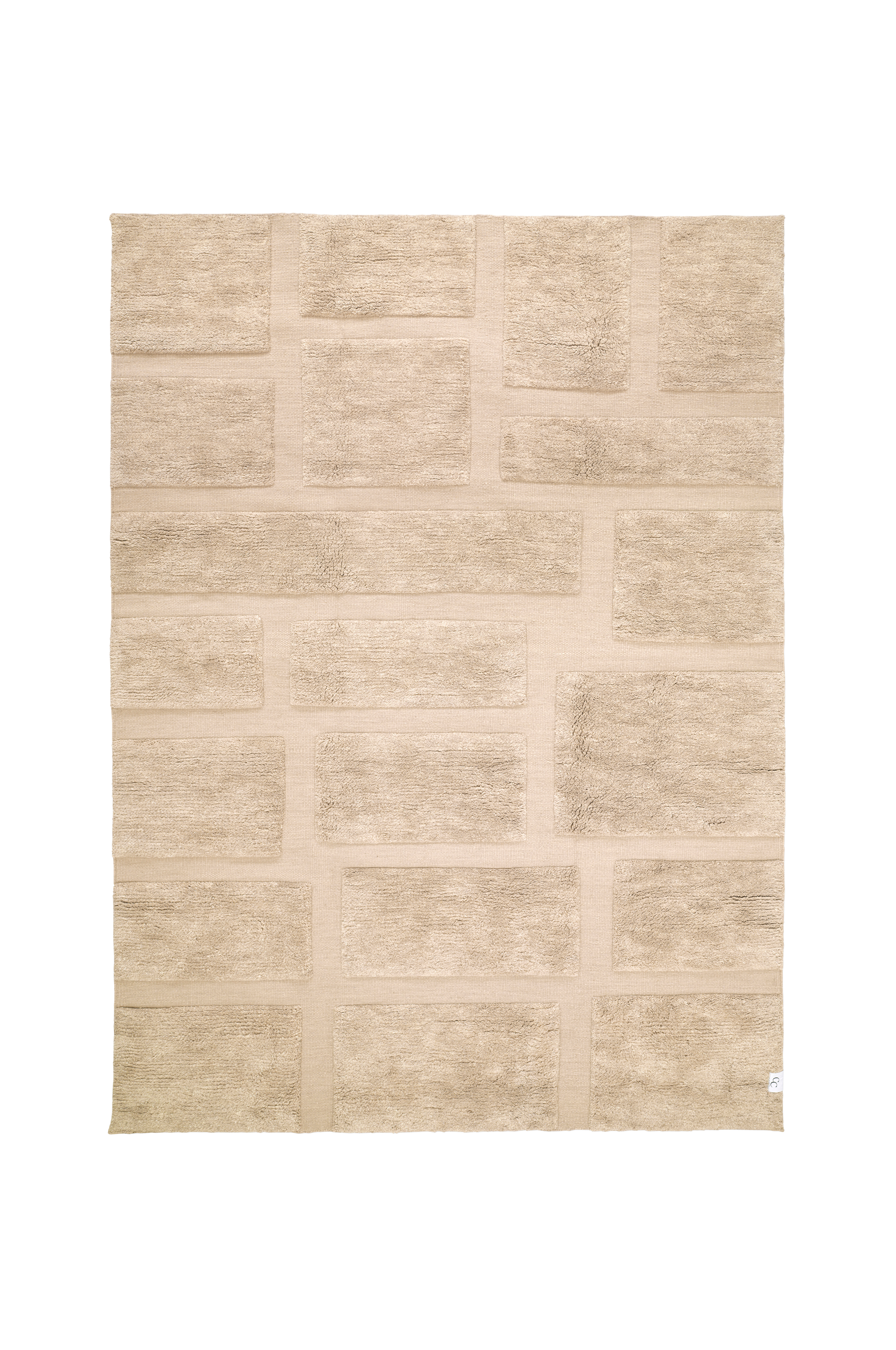 En håndvævet uldtæppe med højt og lavt mønster i form at blokke i forskellige størrelser. Tæppet laves i to farver, Hvid og Beige.