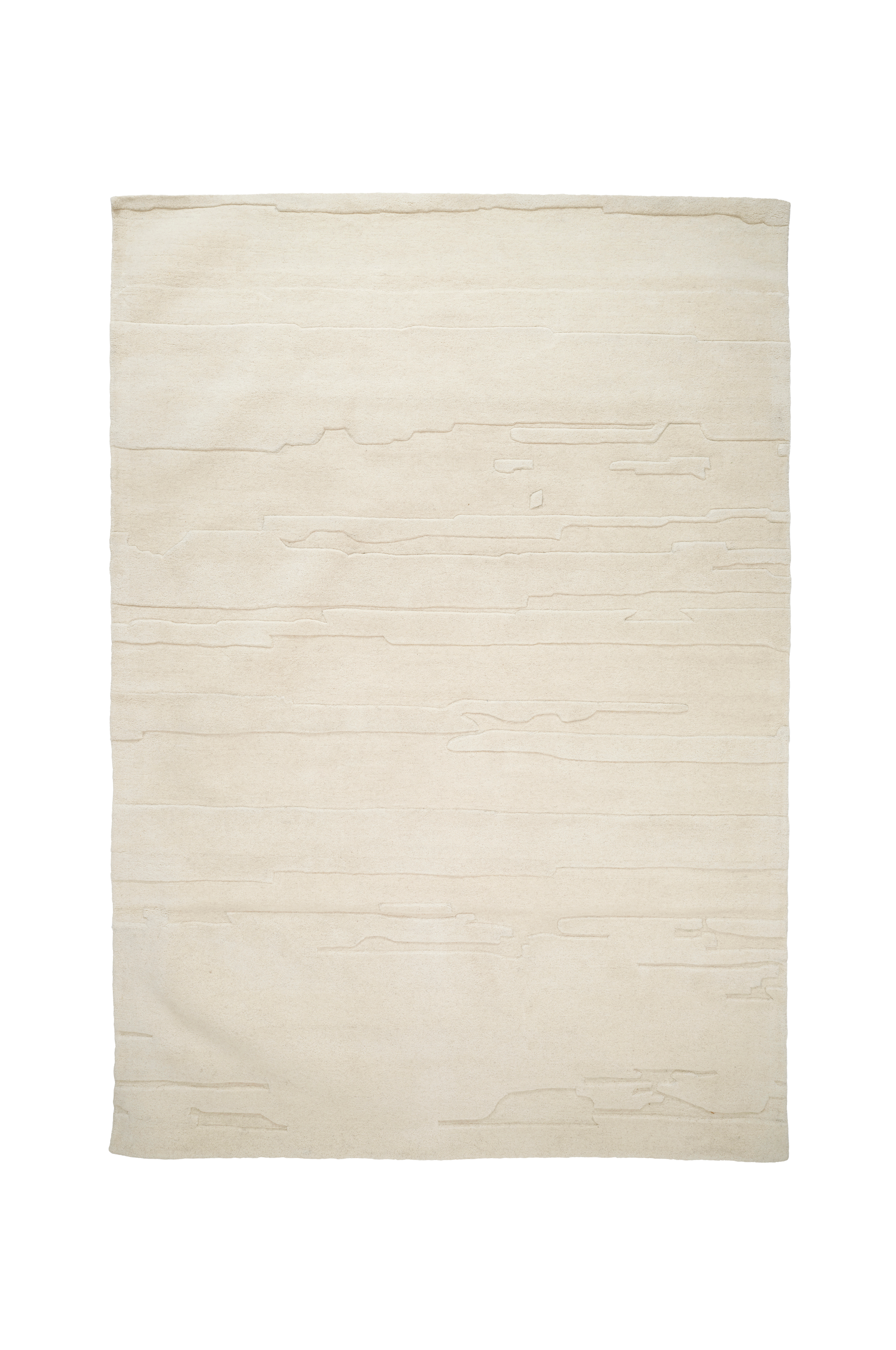 Håndtuftet gulvtæppe af uld, bagside i kanvas. Håndklippet mønster med høj og lav luv. Et design inspireret af menneskelig forarbejdning af naturlige materialer i teknikker som udskæring og ætsning.