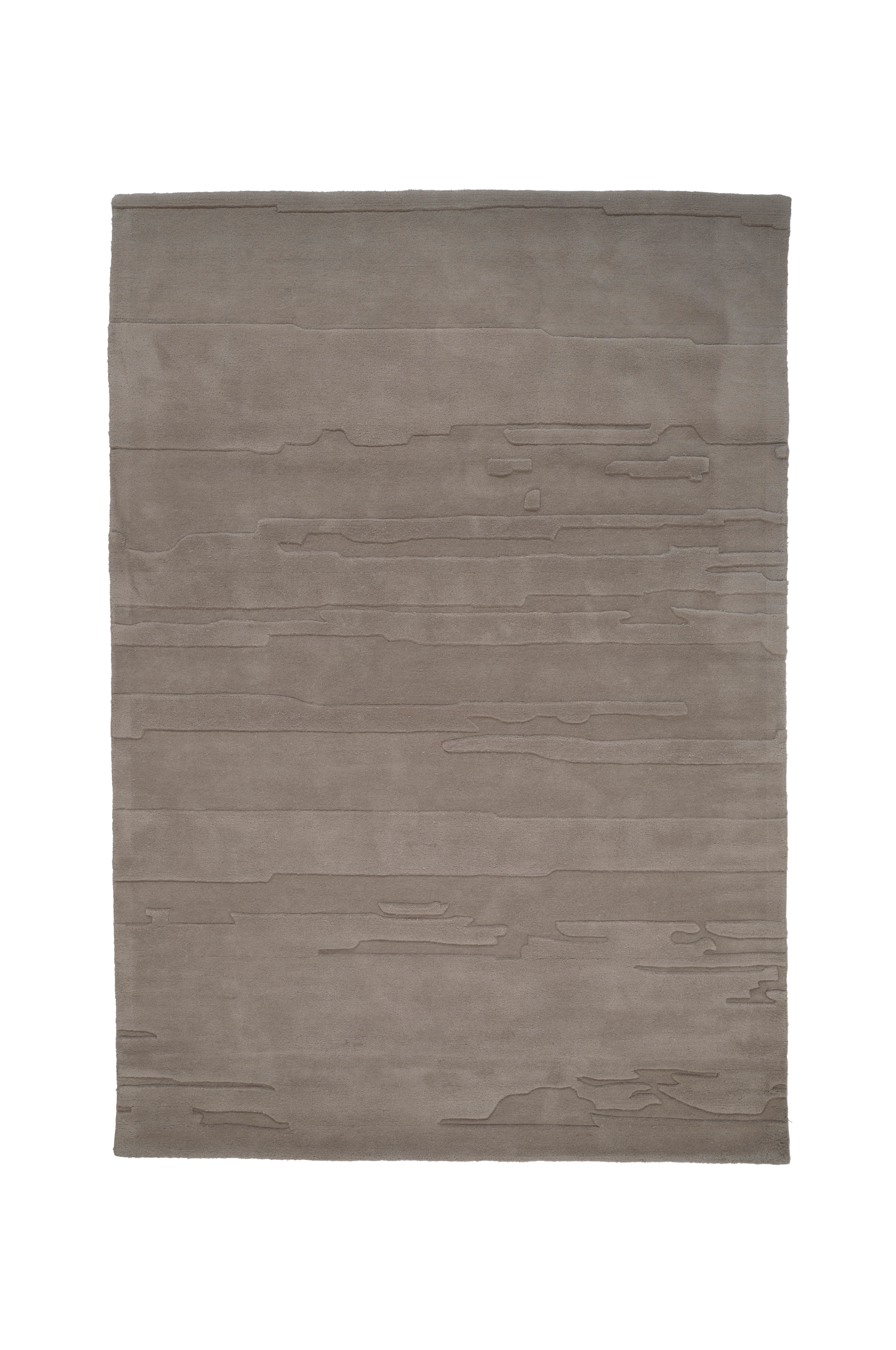 Håndtuftet gulvtæppe af uld, bagside i kanvas. Håndklippet mønster med høj og lav luv. Et design inspireret af menneskelig forarbejdning af naturlige materialer i teknikker som udskæring og ætsning.