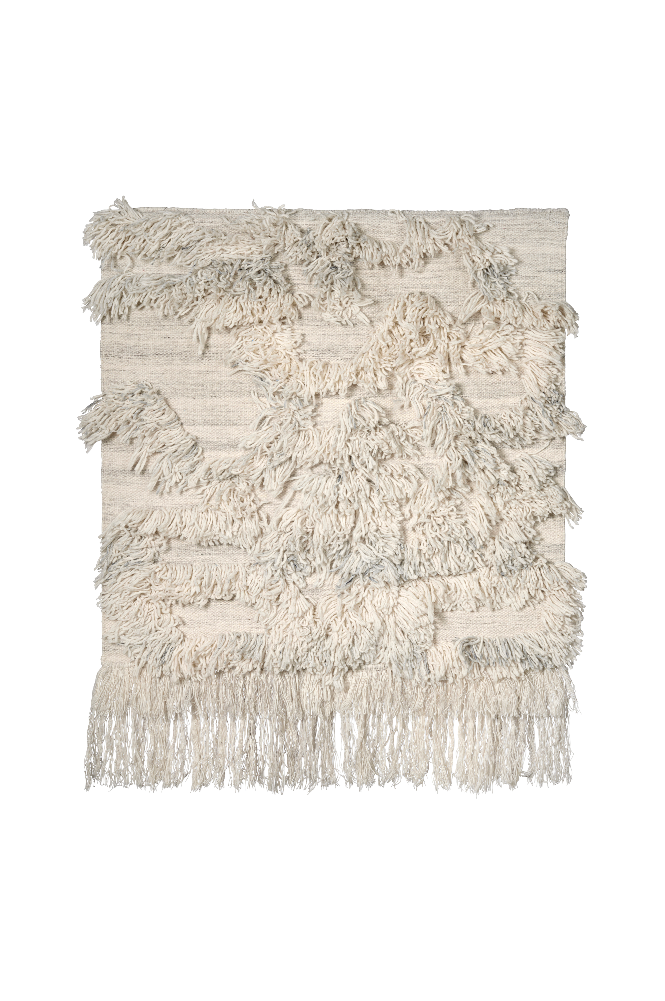Vægdekoration fremstillet i hånden i samme garn og teknik som tæppe Rio. I farverne Beige og Ivory Melange. Løbegang til ophængning syet bagpå i overkant. Smuk at hænge på en kraftigere bambuspind. 100x100