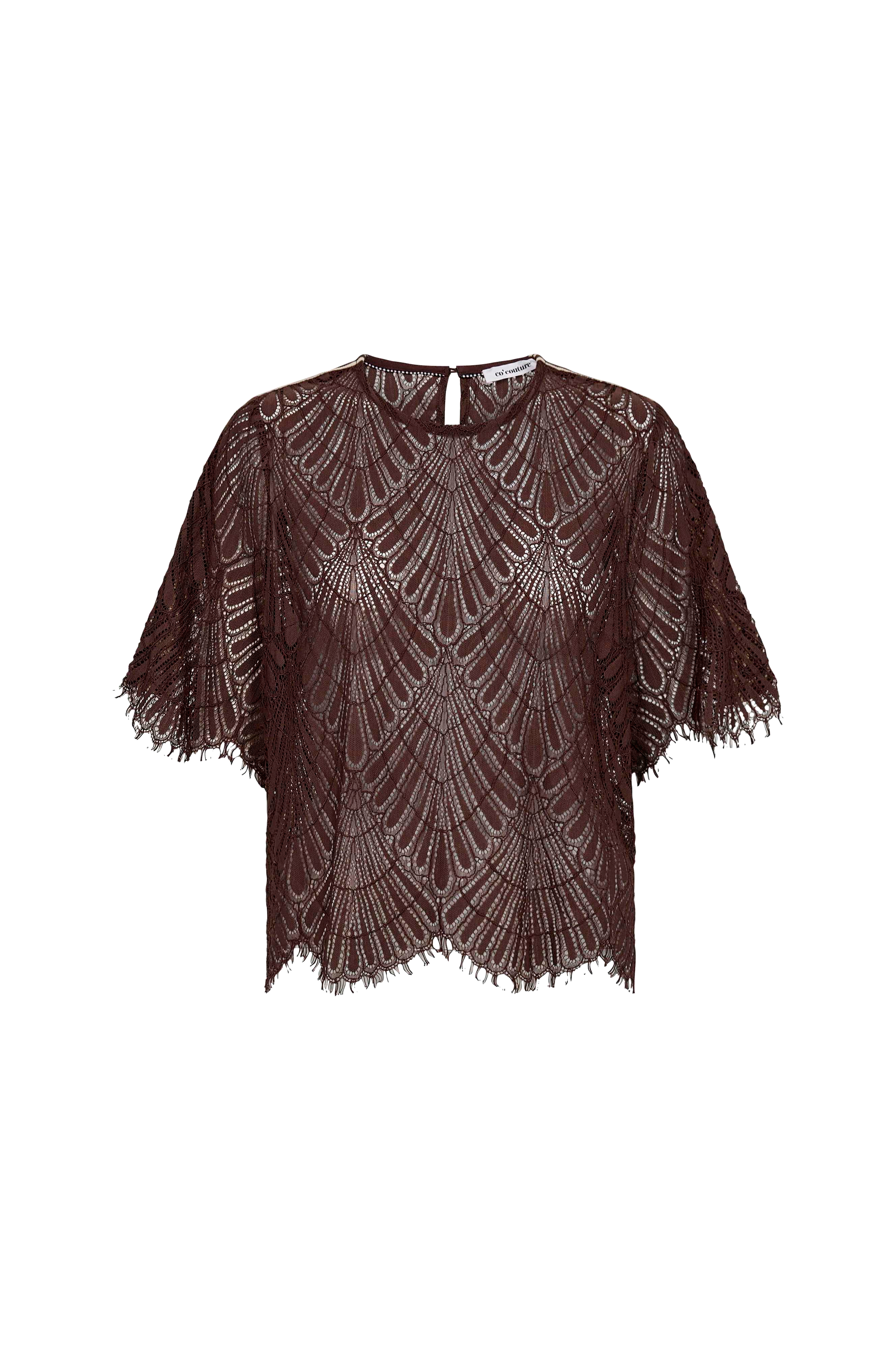 • Bluse i blonde• Korte ærmer med stribet tekstilbånd• Frynset kant ved manchetterne og nederst• Slids med knap i nakken