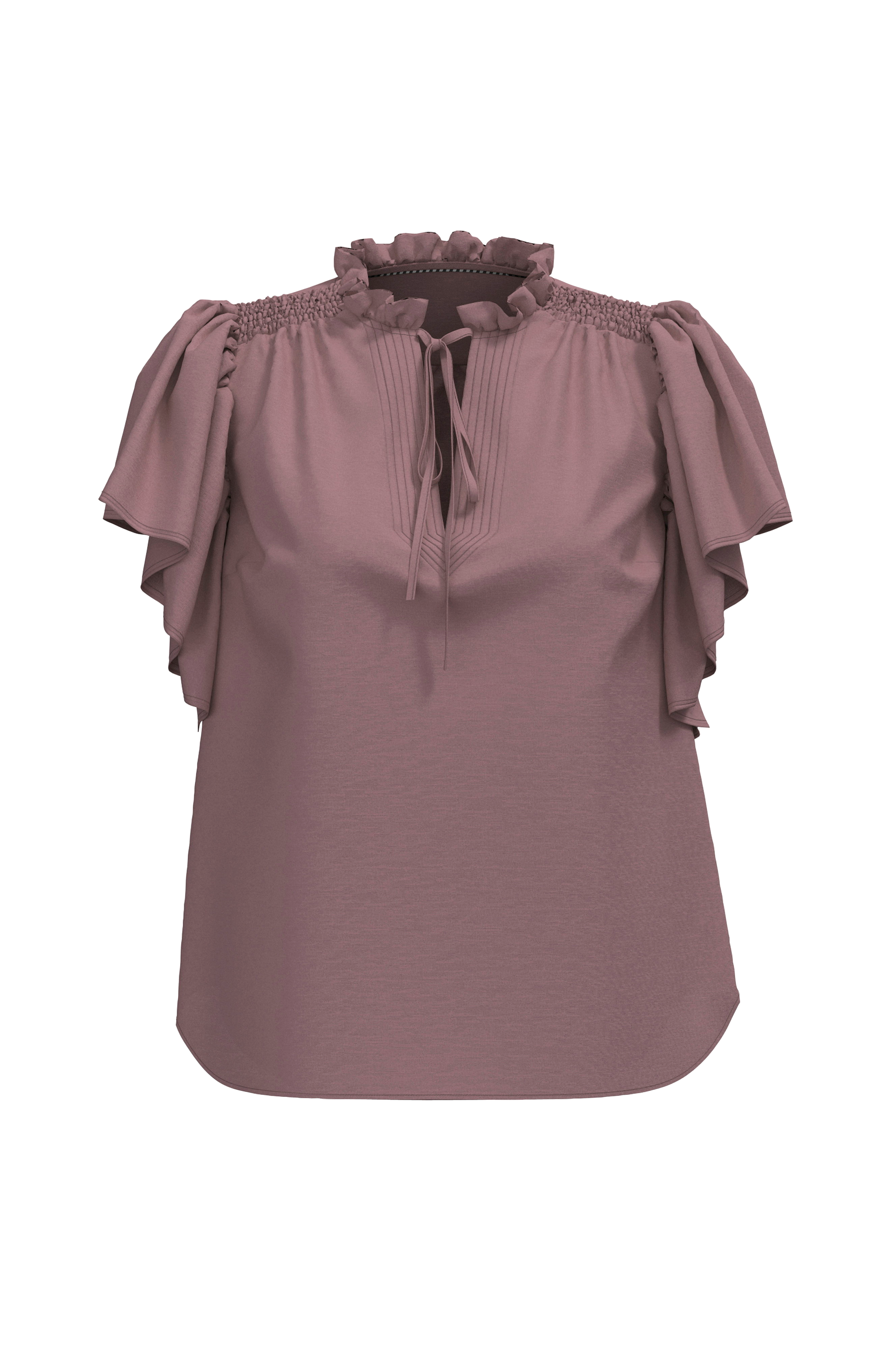 • Bluse med korte flæseærmer• Rund halsudskæring med volant og dyb slids• Smockdetalje på skuldrene• Afrundet søm• Samling oppe bagved