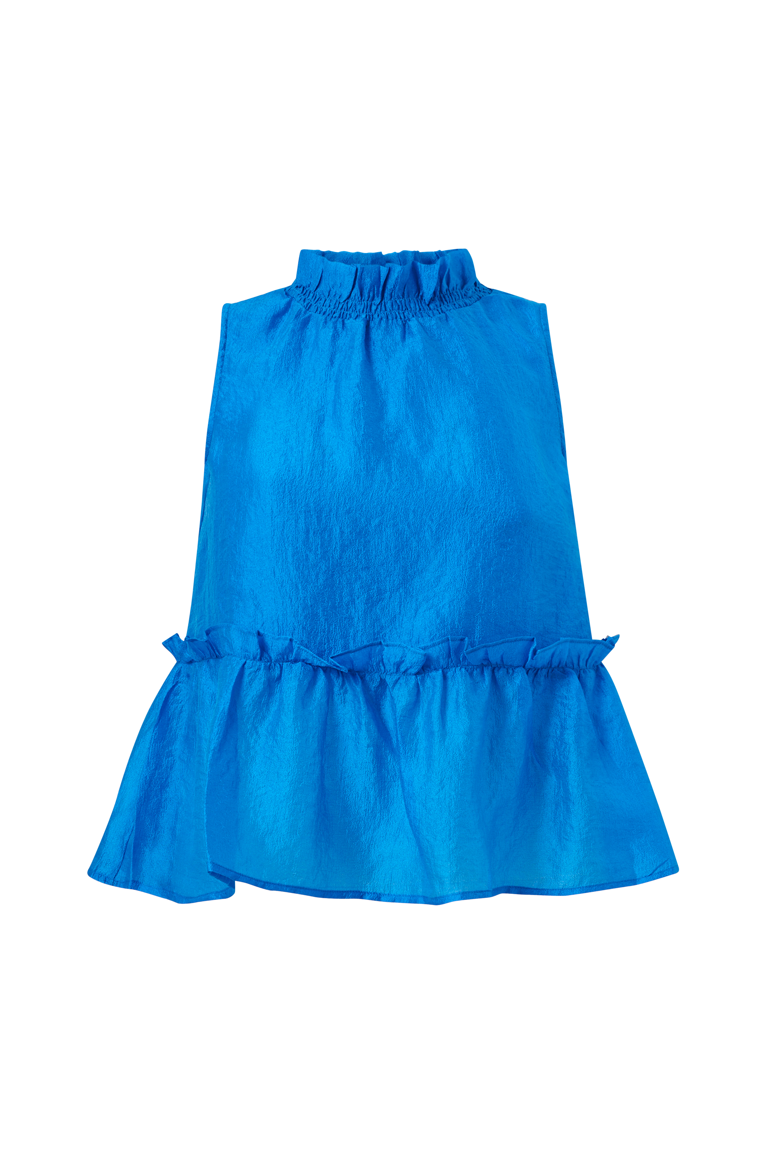 • Ærmeløs model• A-linje design• Elastisk opretstående krave med volant• Volant ved taljen