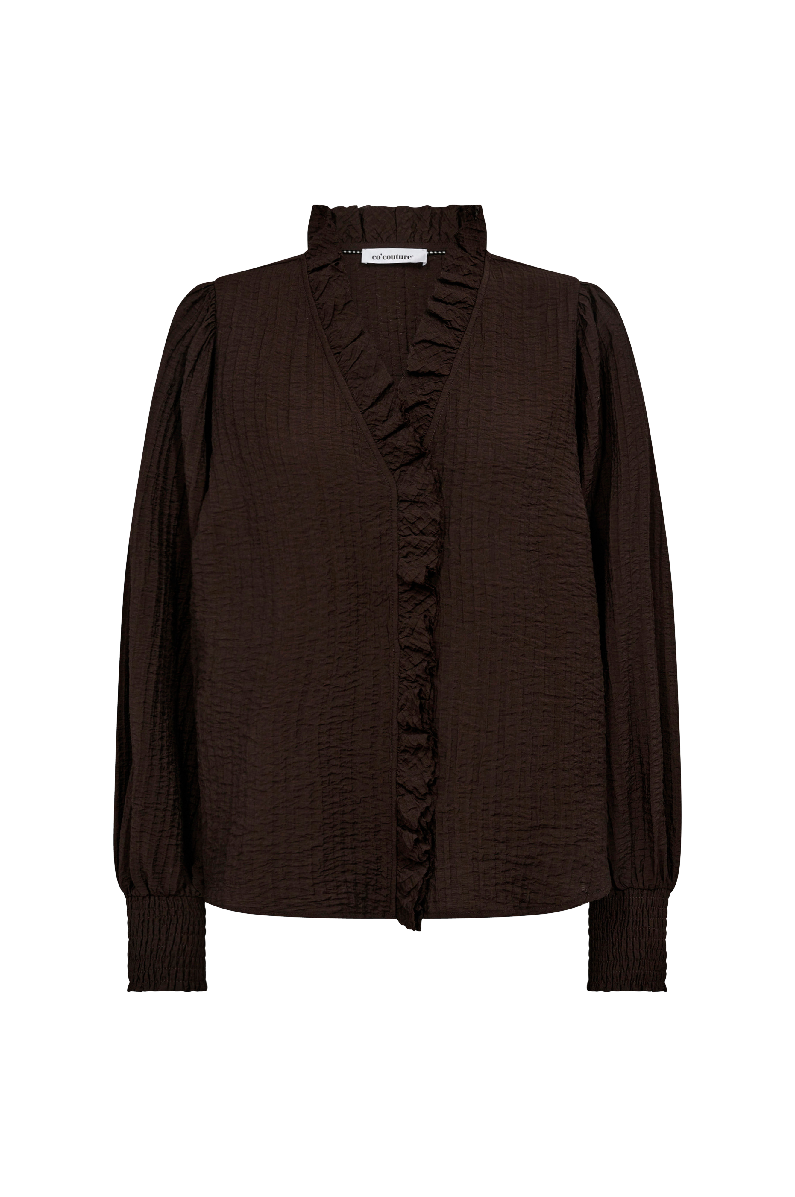 • Semitransparent bluse i viskoseblanding med let krøllet materiale• V-formet halsudskæring med volant hele vejen rundt og foran• Skjult knaplukning foran foran• Langt ballonærme med smock ved manchetterne