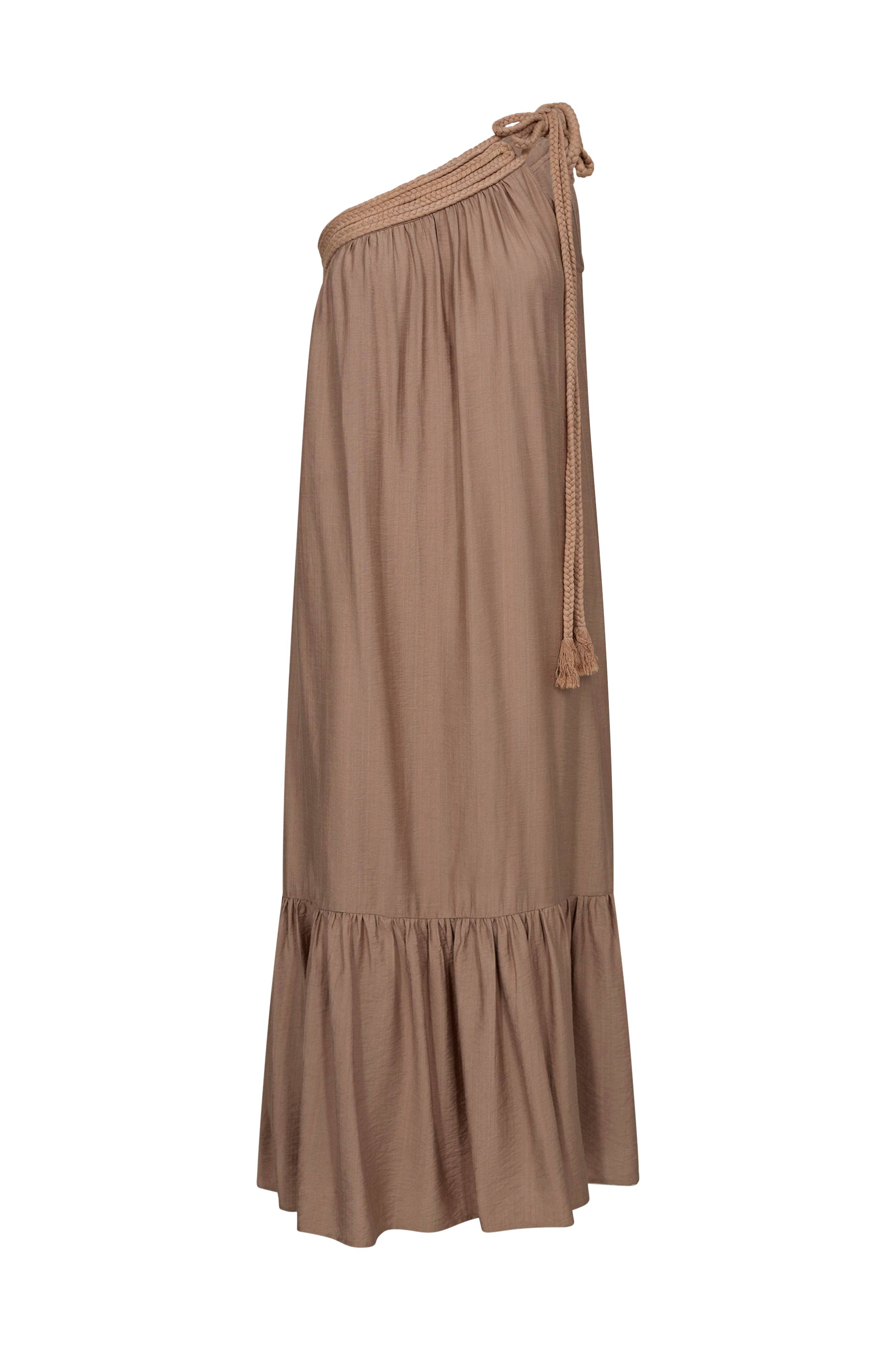 • Ærmeløs kjole• Asymmetrisk design på toppen• Design af reb med bindbart bånd på en skulder• Volant nederst• Længde: 127 cm i størrelse S