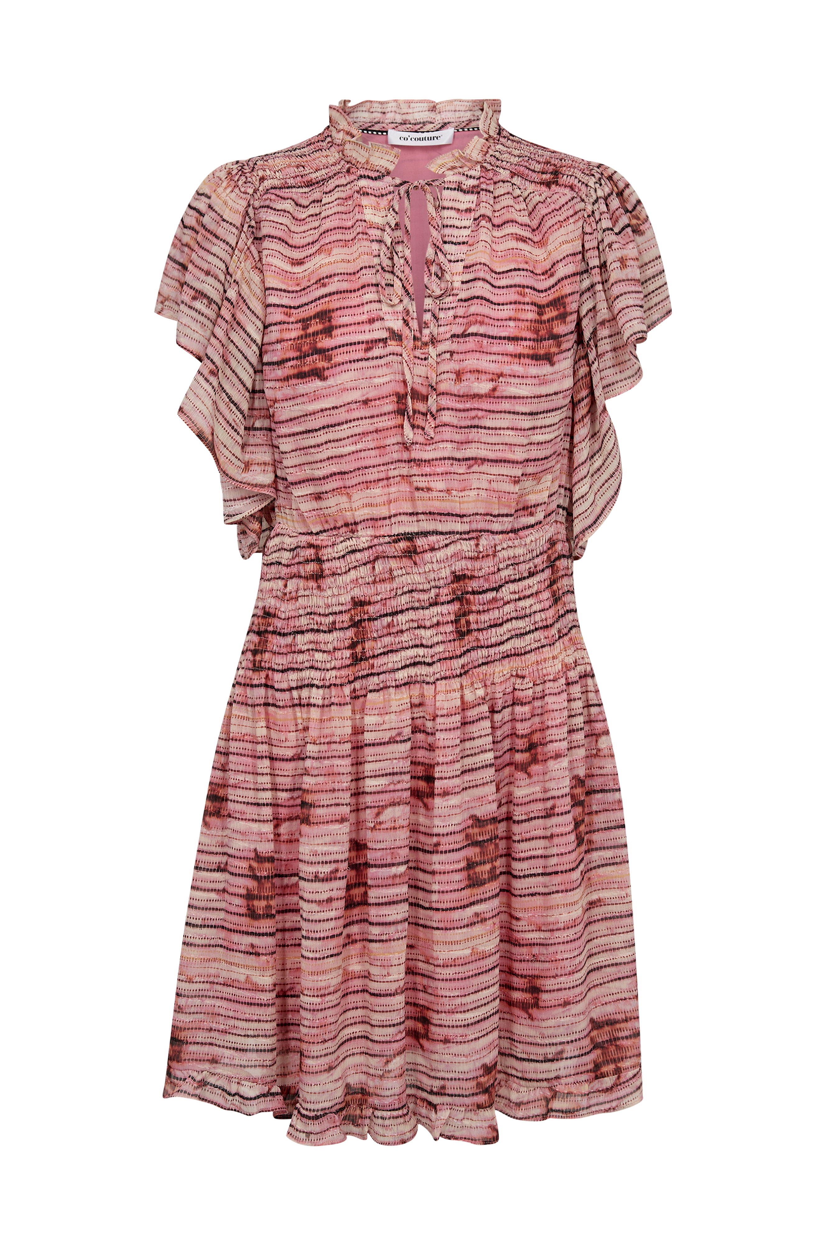 • Kjole i chiffon• V-udskæring med bindebånd• Flæsekant i halsen• Brede sommerfugleærmer• Bred smock ved taljen• Foret• Længde: 87 cm i størrelse S