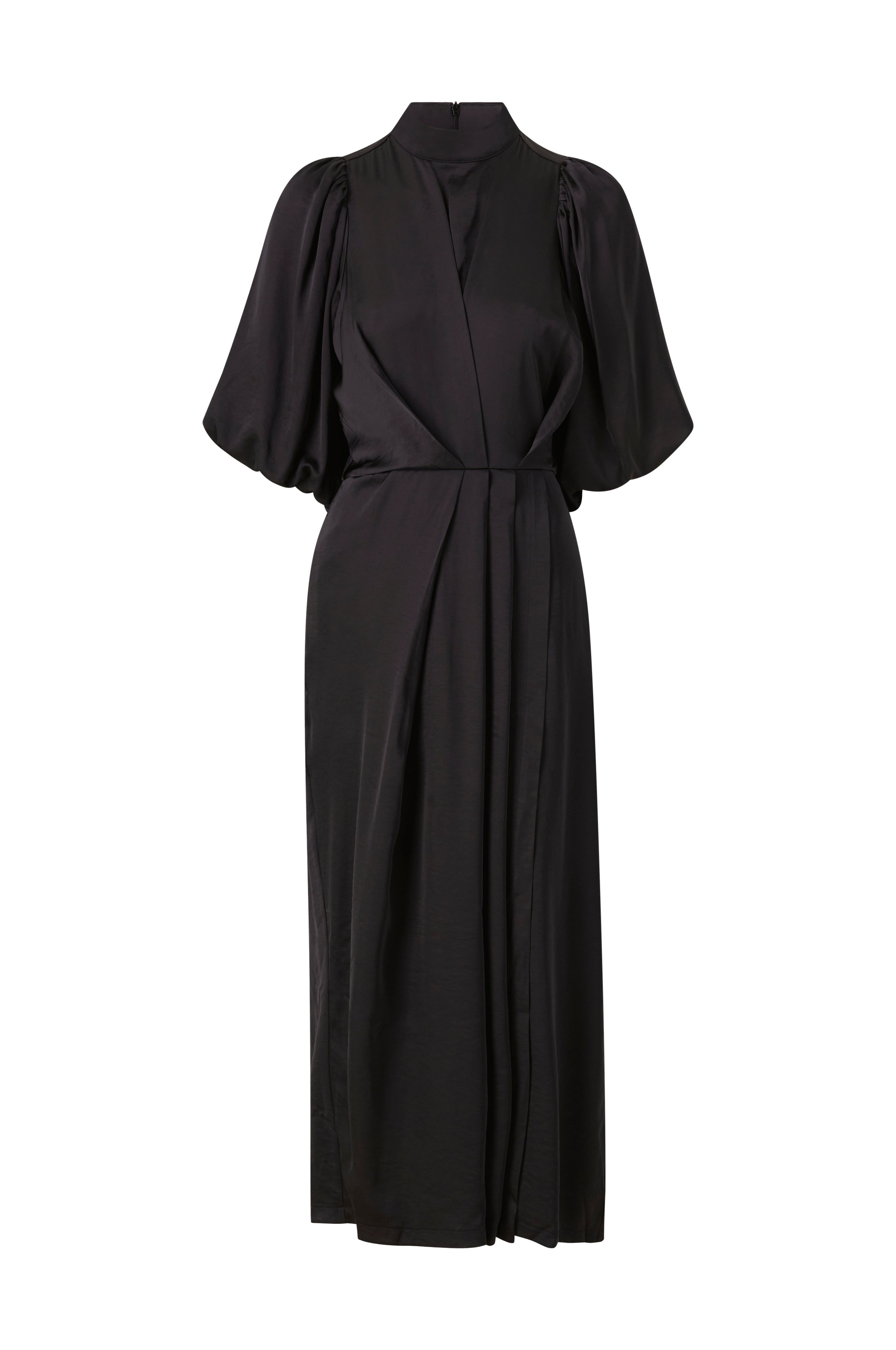 • Lang kjole i satin• Høj udskæring• Halvlange ballonærmer• Lægge foran• Skjult lynlås i ryggen• Slå-om design på skørtet• Længde: 133 cm i størrelse S