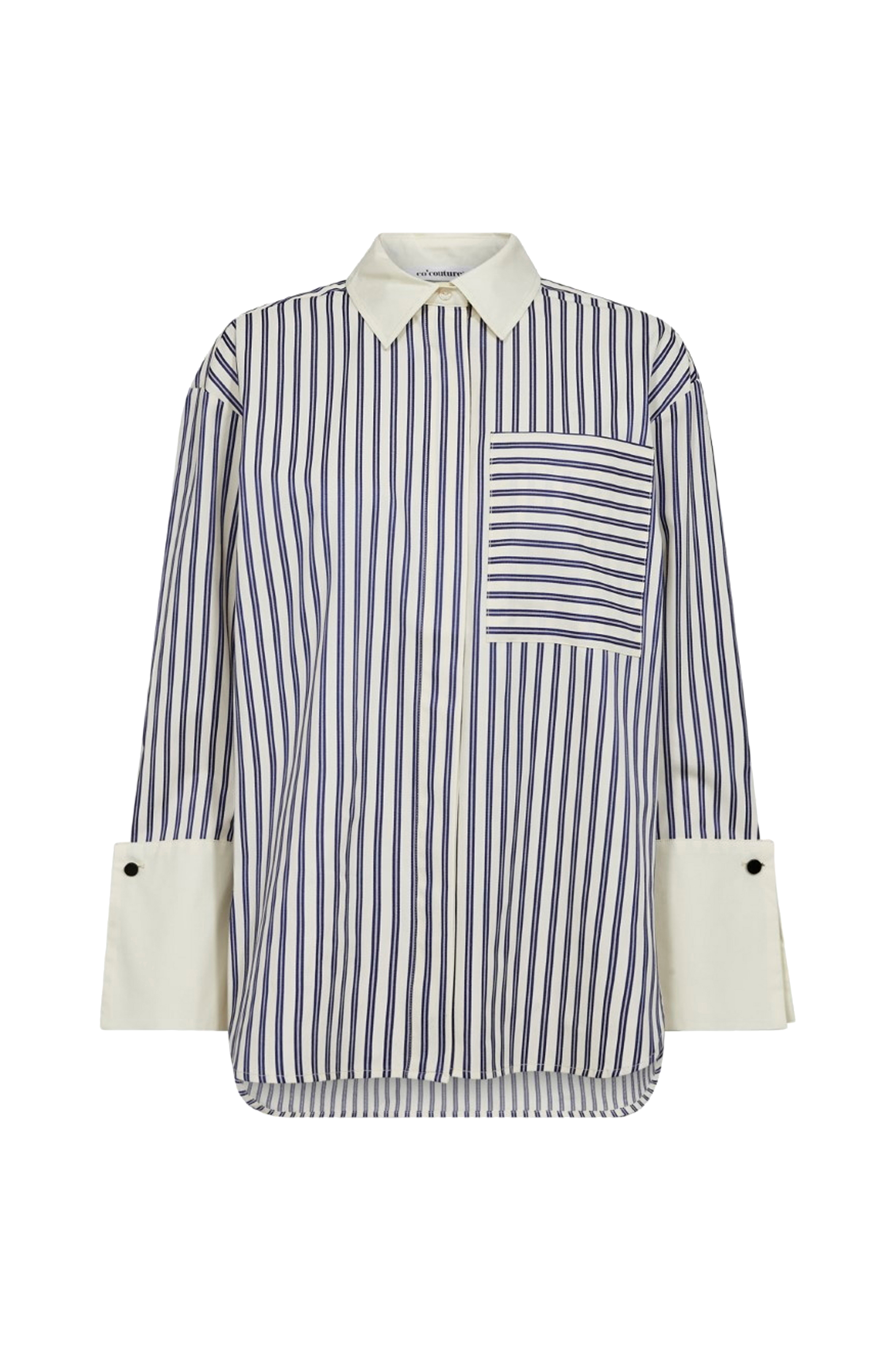 • Stribet skjorte med løs pasform• Skjult knaplukning foran foran• Brystlomme• Brede manchetter med knap• Afrundet søm med lidt længere bagside og slids nede i siderne