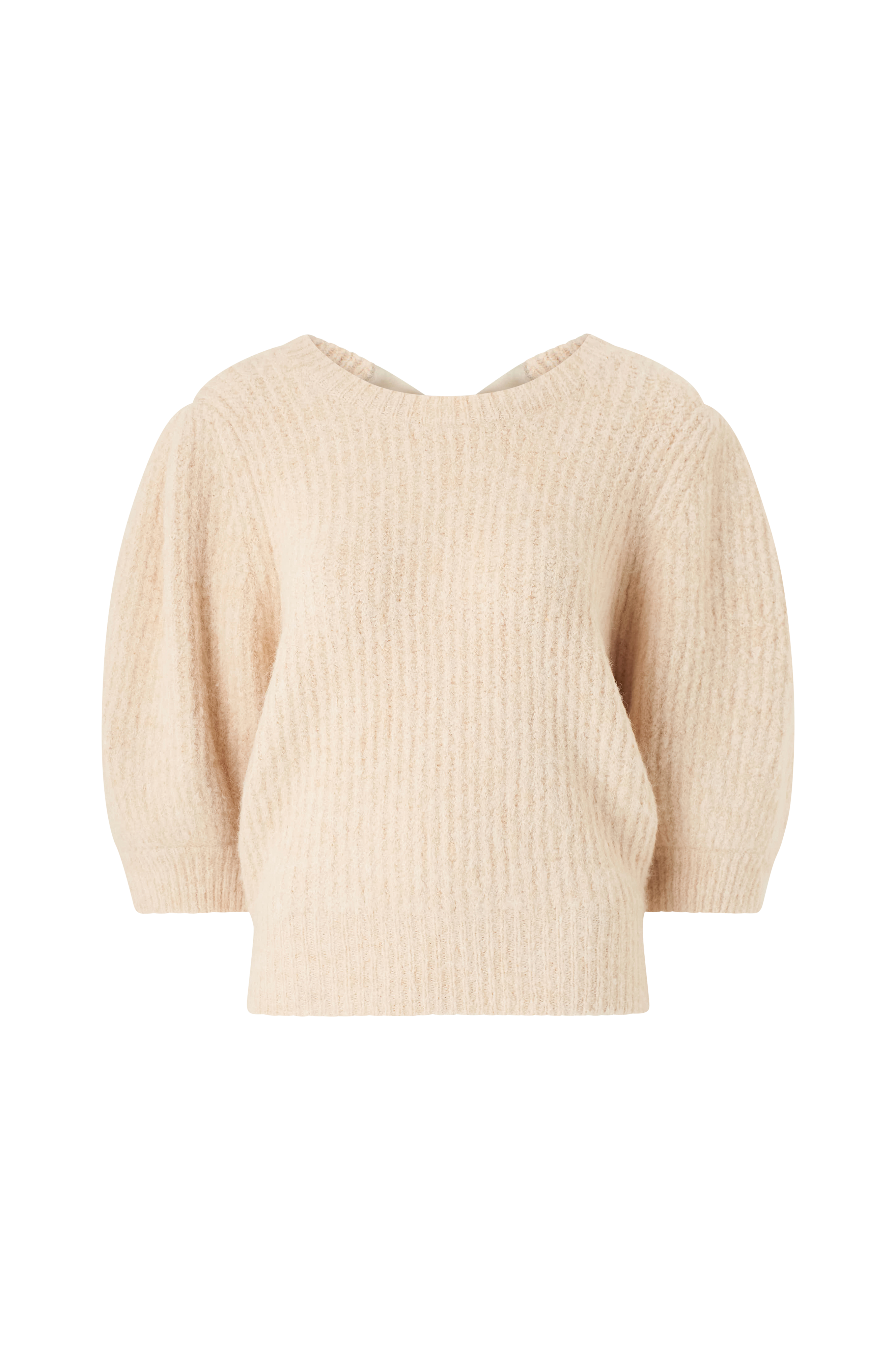 • Rund hals med afrundet ventilation og langt, vævet bindebånd i nakken