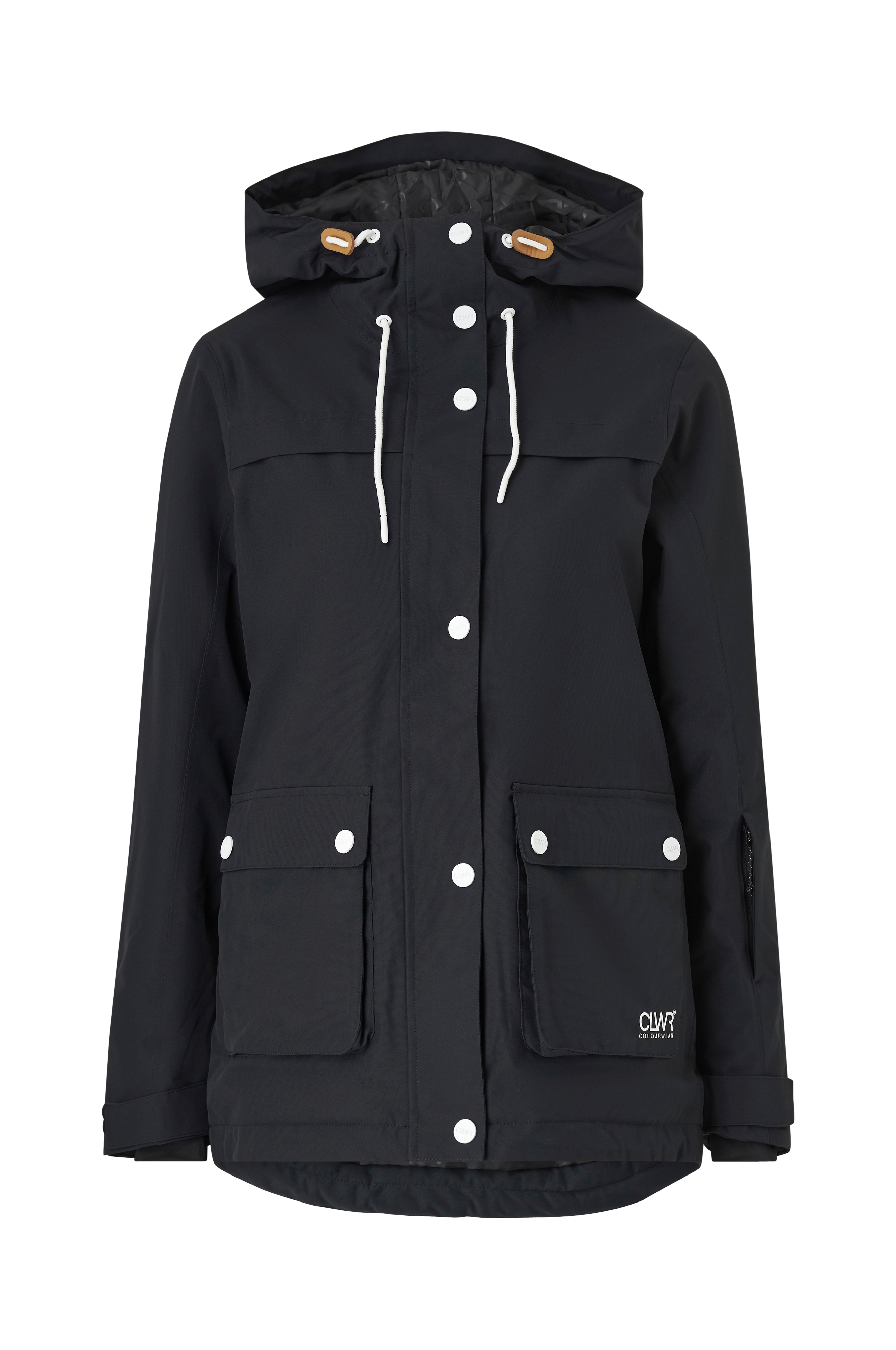 • Skijakken har en inderlomme i mesh, aftageligt sneskørt ved taljen og træksnørre ved nederste kant