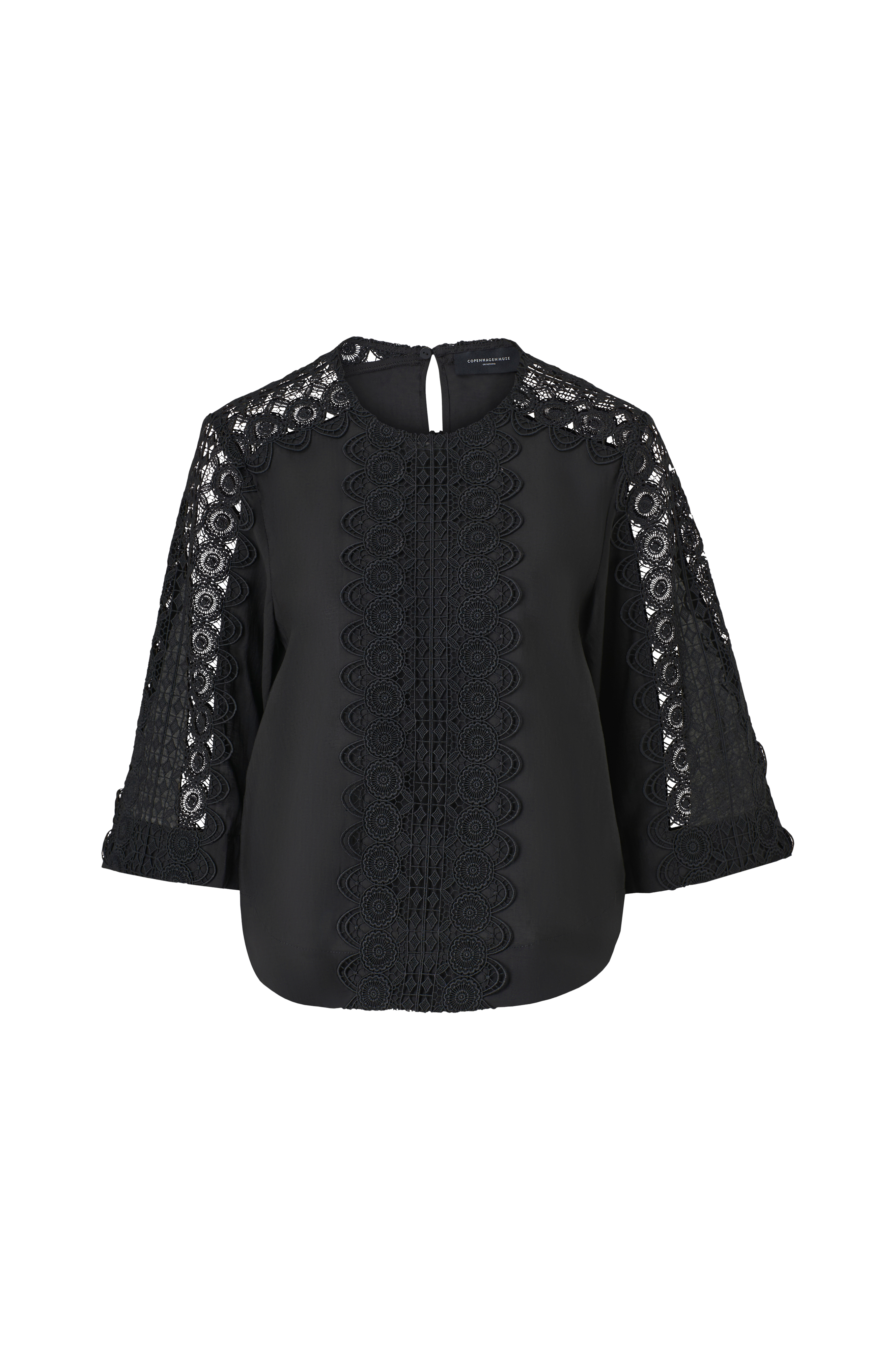 • Bluse med blondedetaljer• Brede, 3/4 lange ærmer• Ventilation med knap i nakken• Afslappet pasform