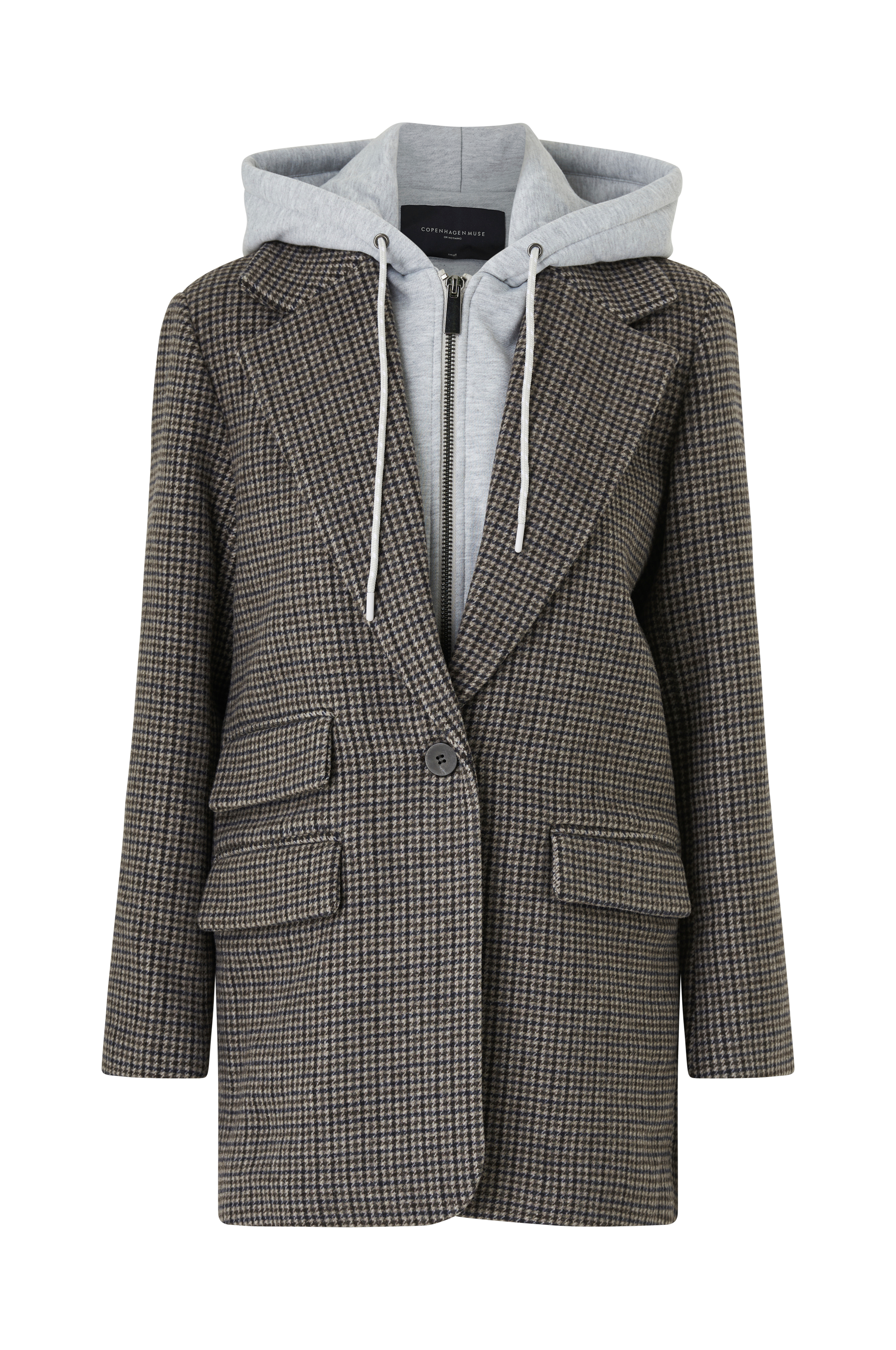 • Jakke i uldblanding med brede reverser• To lommer med lommelåg• Slids nede bagved• Aftagelig hætte og hagesmæk i sweatshirtmateriale bag knapperne foran• Længde: 80 cm i størrelse S