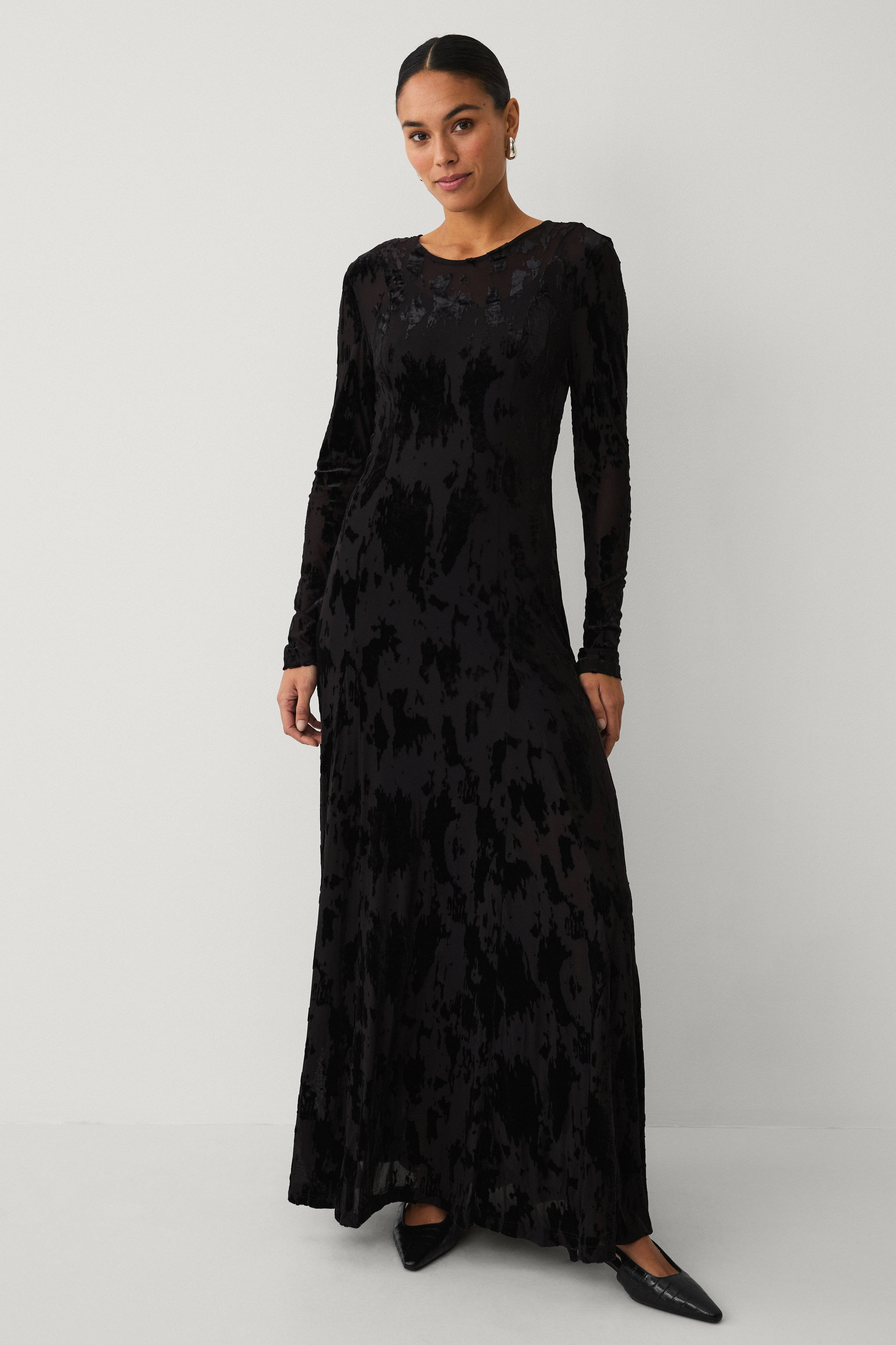 • Lang, figursyet kjole med nedre del med svaj• Transparent stof med mønster i velour• Rund halsudskæring• Nøglehulsåbning i nakken med tre beklædte knapper• Lange ærmer• Udtagelig underkjole i jersey• Længde: 159 cm i størrelse S