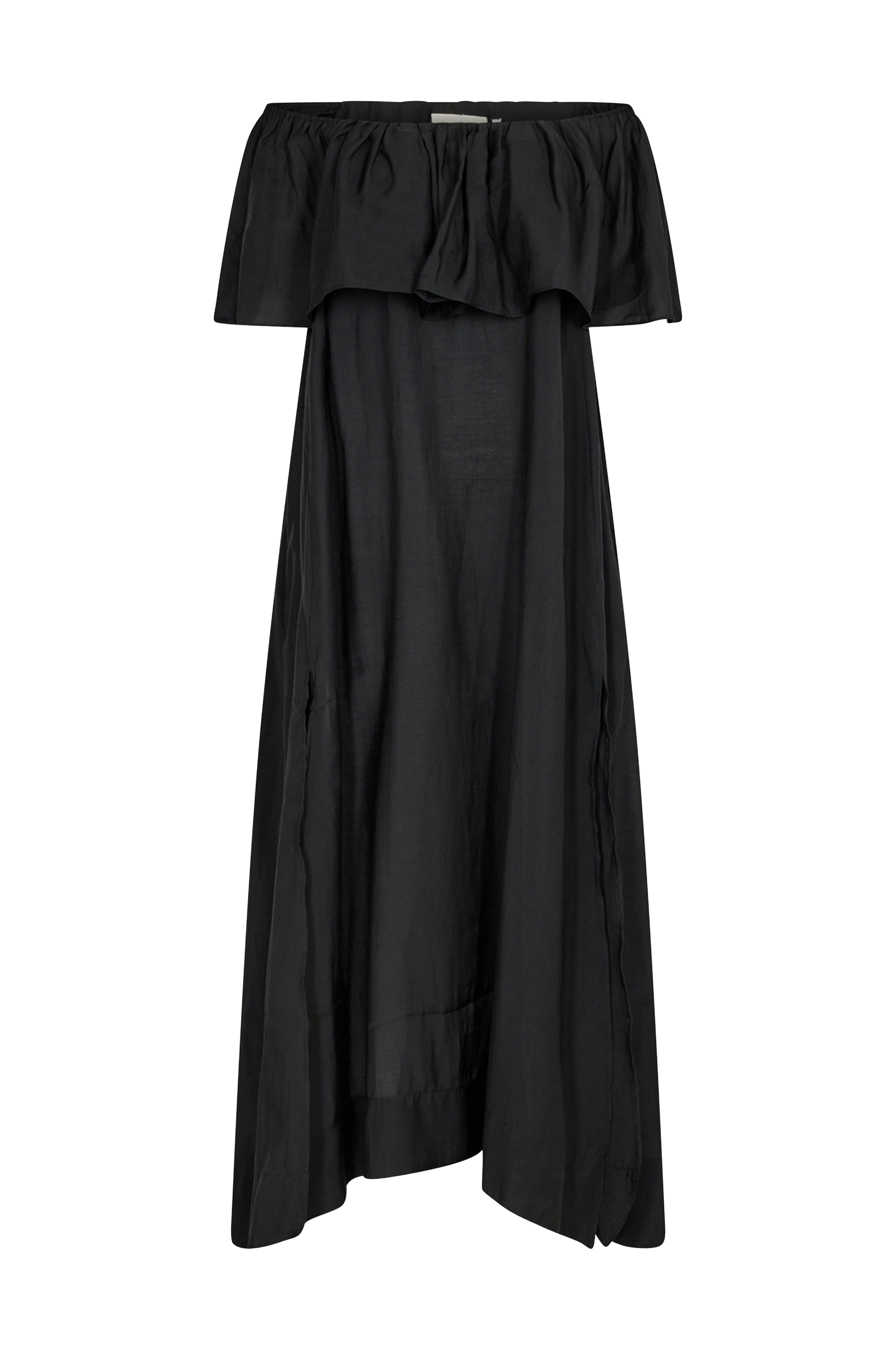 • Off-shoulder udskæring med volant hele vejen rundt• Bredt, aftageligt bælte med metallukning• Høje slidser nede i siderne• Længde: 147 cm i størrelse S