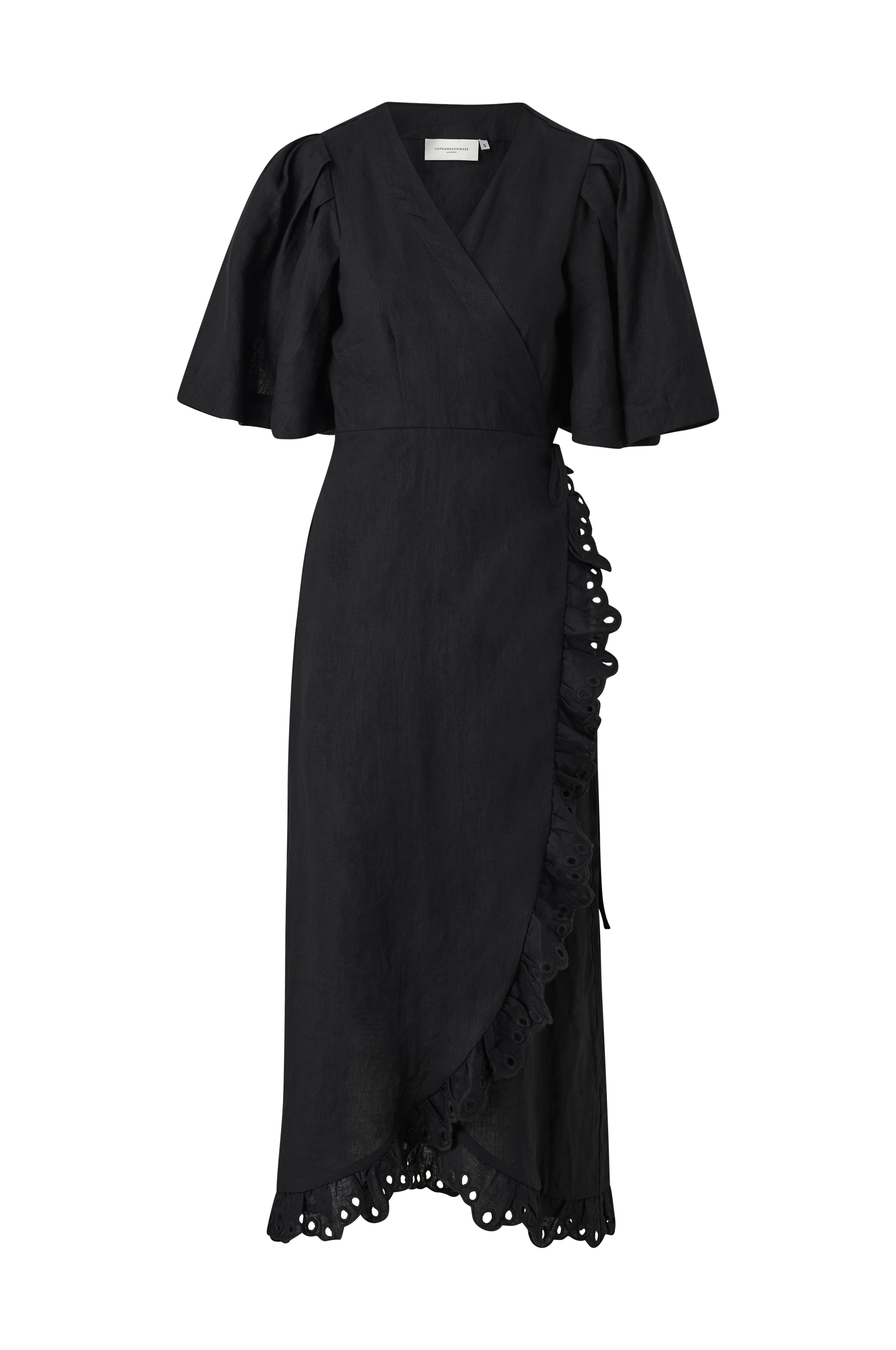 • Lang kjole i hør• Slå-om design• Bindebånd i siden• Ekstra brede, halvlange ærmer• Lægge på skuldrene• Volant med broderet hulmønster på skørtet• Længde: 132 cm i størrelse S
