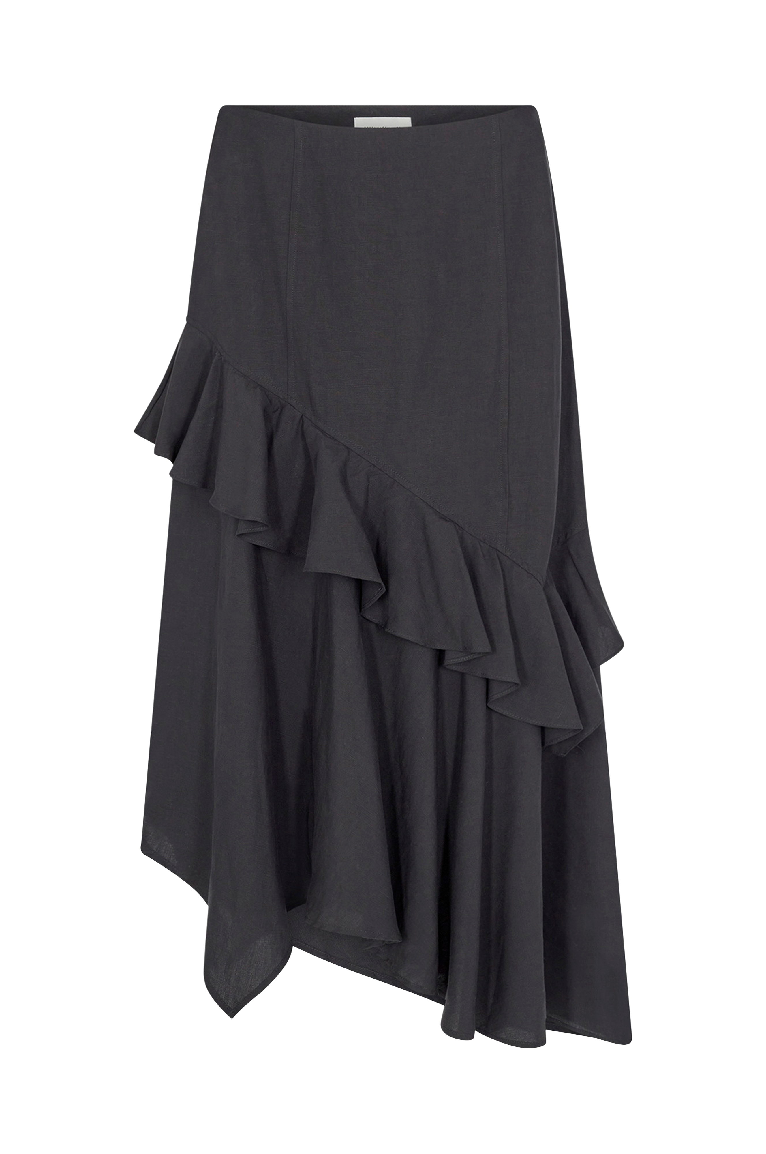 • Nederdel i hørblanding• Asymmetrisk søm• Lynlås i den ene side• Volant hele vejen rundt• Længde: 93 cm i størrelse S