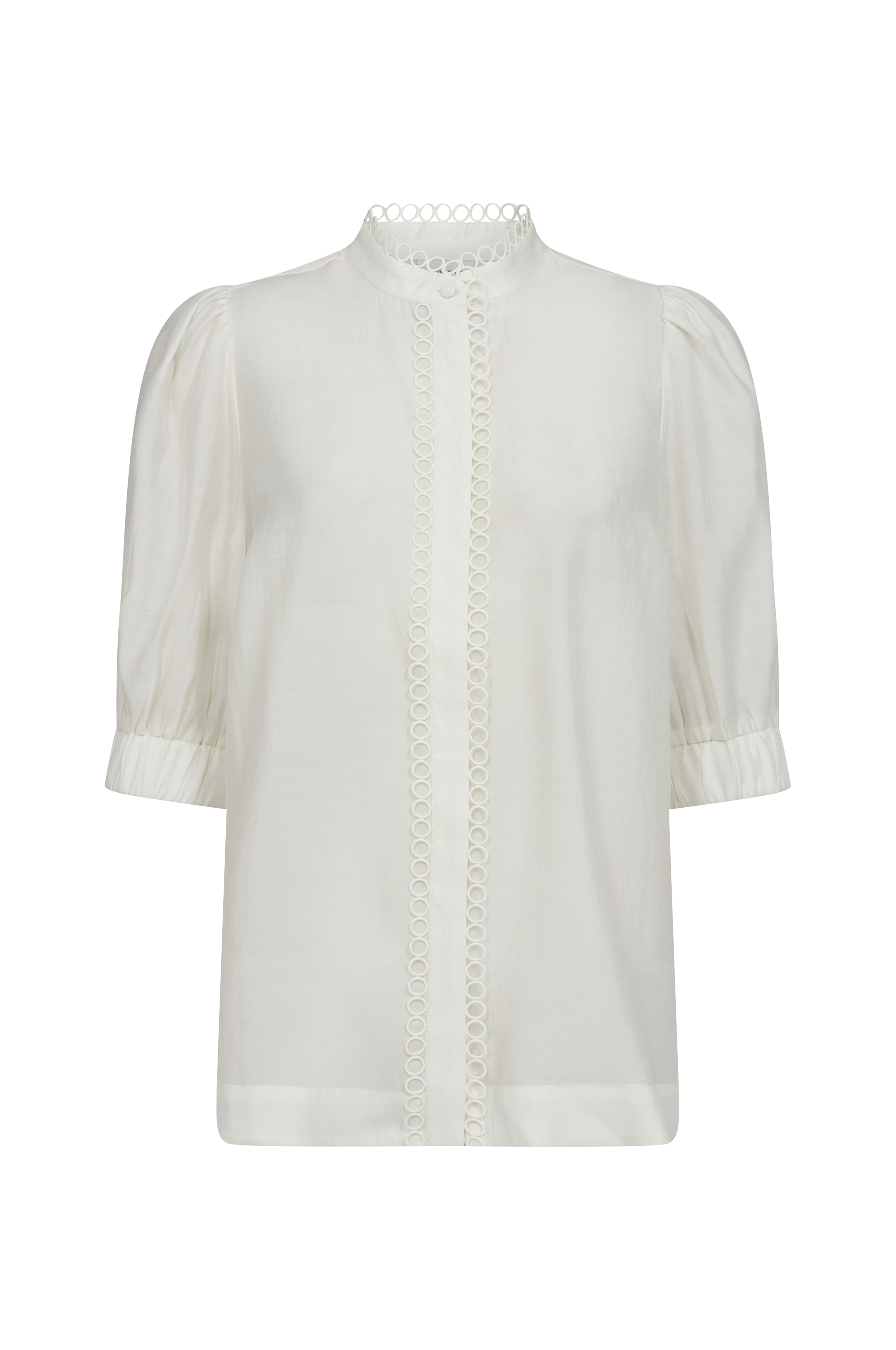 • Skjulte knapper foran• Dekorativ kant i halsen og foran• Halvlange ballonærmer med elastisk bånd ved manchetterne