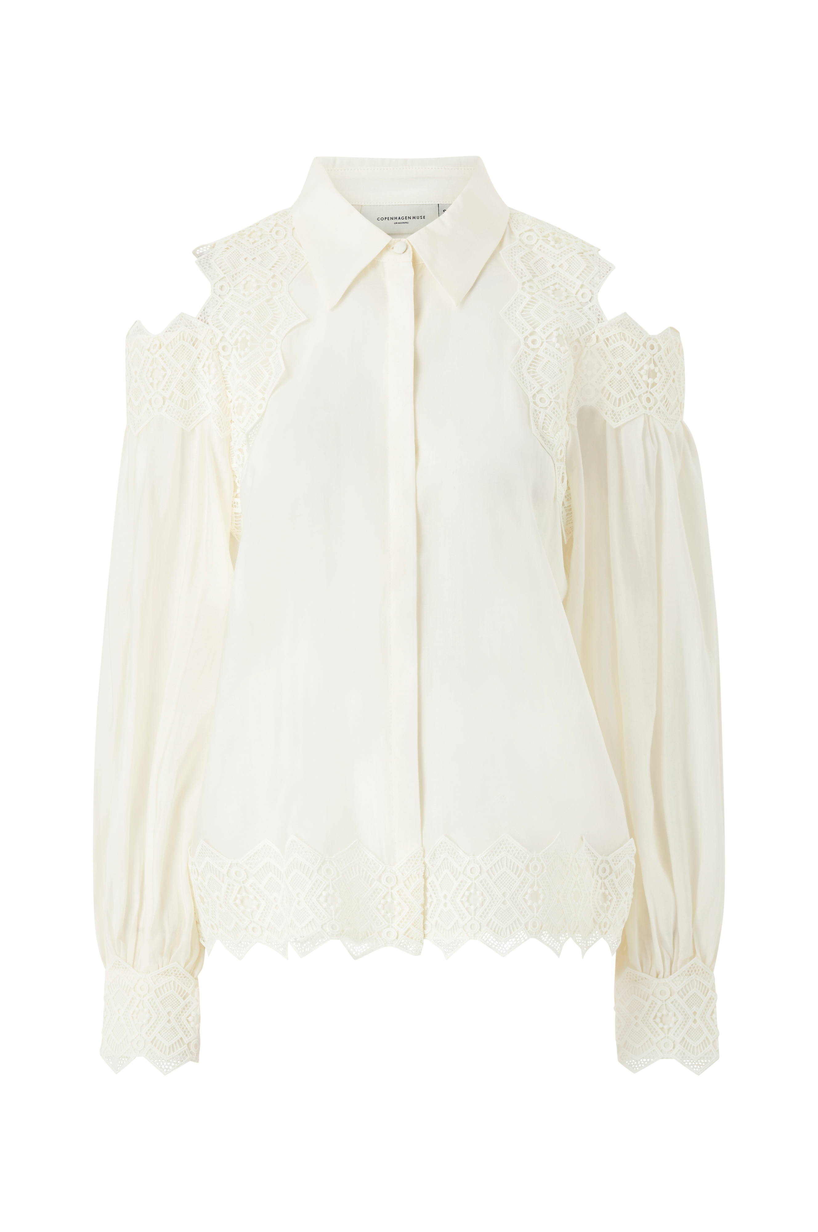 • Åbning på skuldrene• Blondedetaljer• Skjulte knapper foran• Ballonærmer
