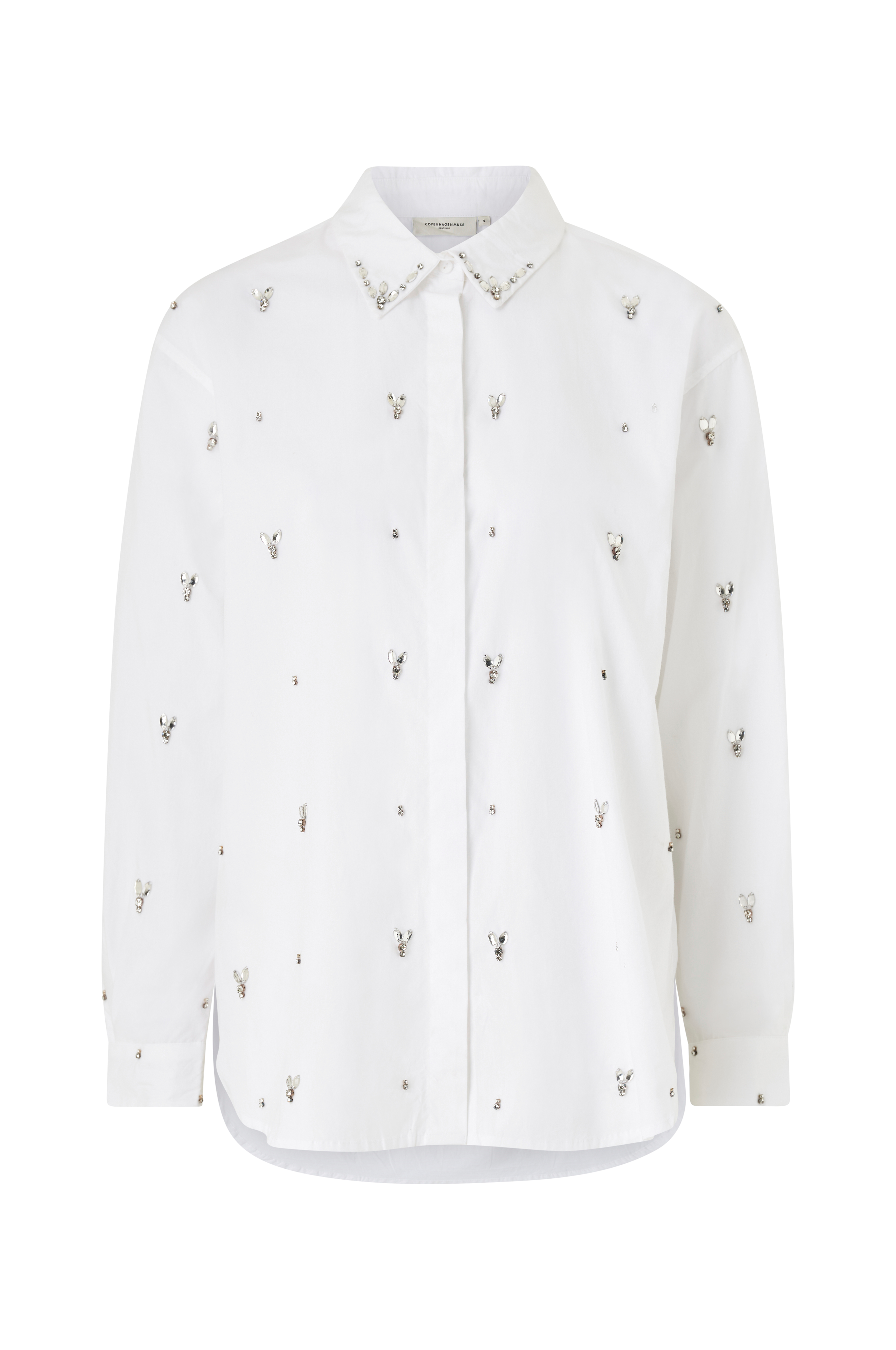 • Lige, uformel model• Broderede rhinstene overalt• Knapstolpe med skjulte knapper• Langt ærme med manchet• Afrundet søm