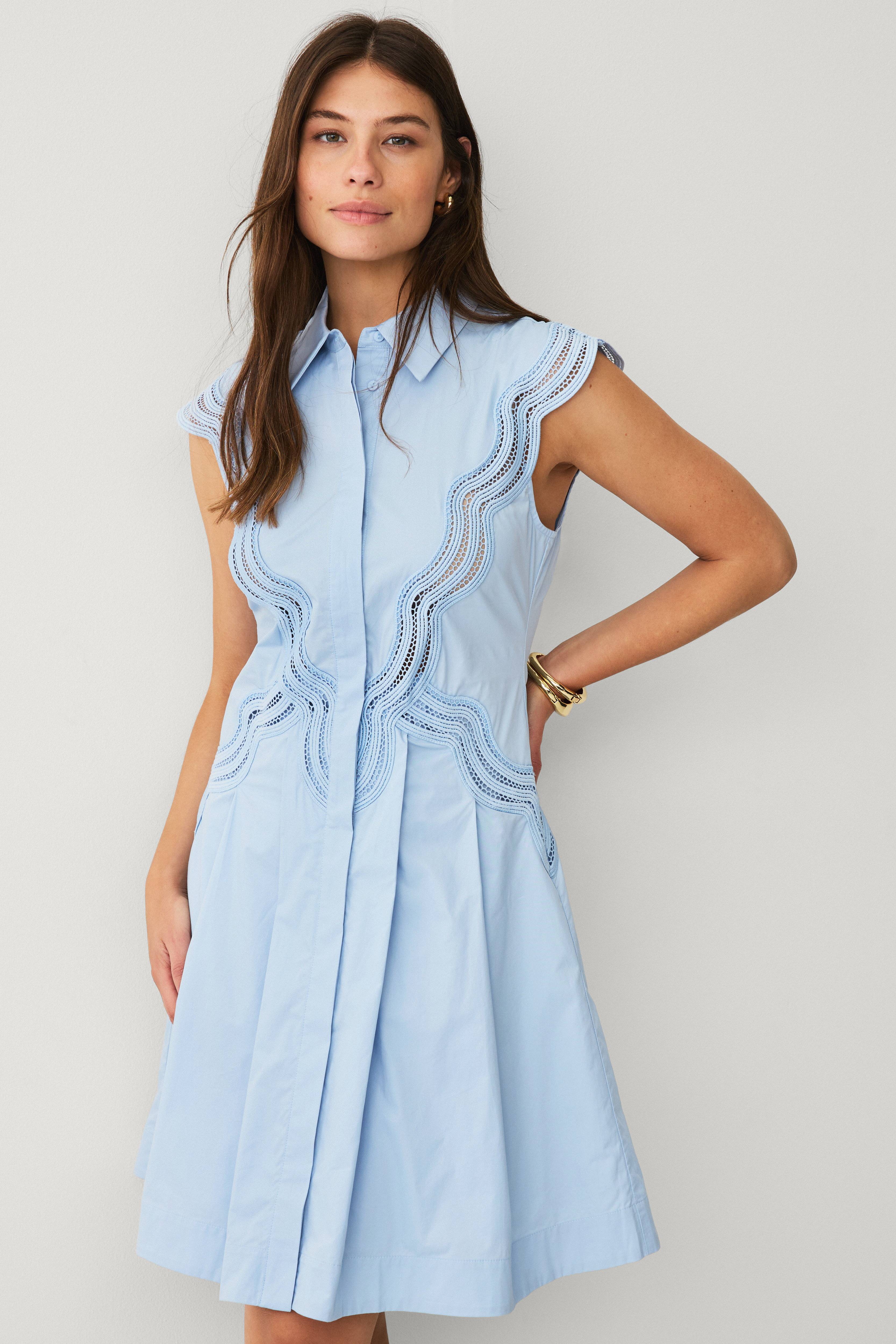 • Skjortekjole med hulbroderede detaljer• Ærmeløst design• Model med svaj• Knapstolpe hele vejen frem• Bølgeformede detaljer foran og bagpå• Tekstilforing• Figursyet pasform• Længde: 97 cm i størrelse S