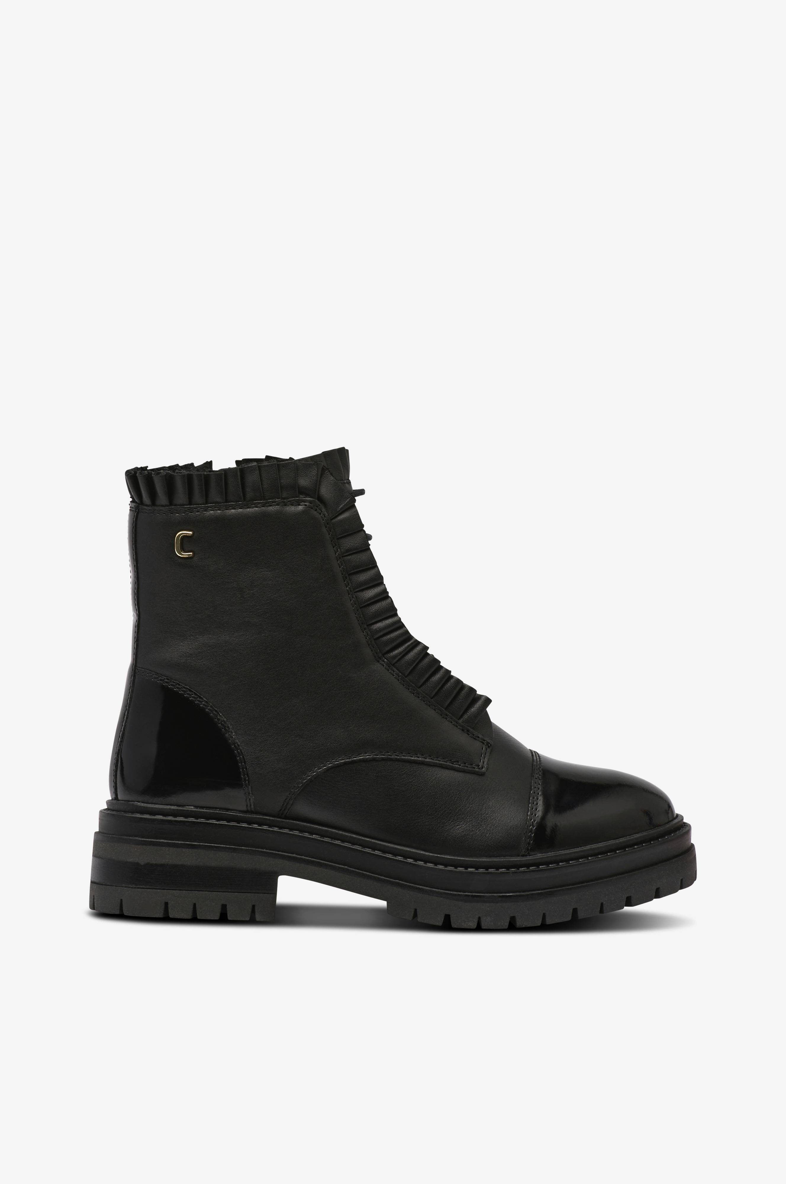 • Boots i læder med blanke, lakerede detaljer • Lynlås på indersiden af skaftet • Snøring foran • Volantdetaljer i læder rundt om skaftet og ved fronten • Indersål i latex • For i tekstil og læder • Skafthøjde: 13 cm i str. 37