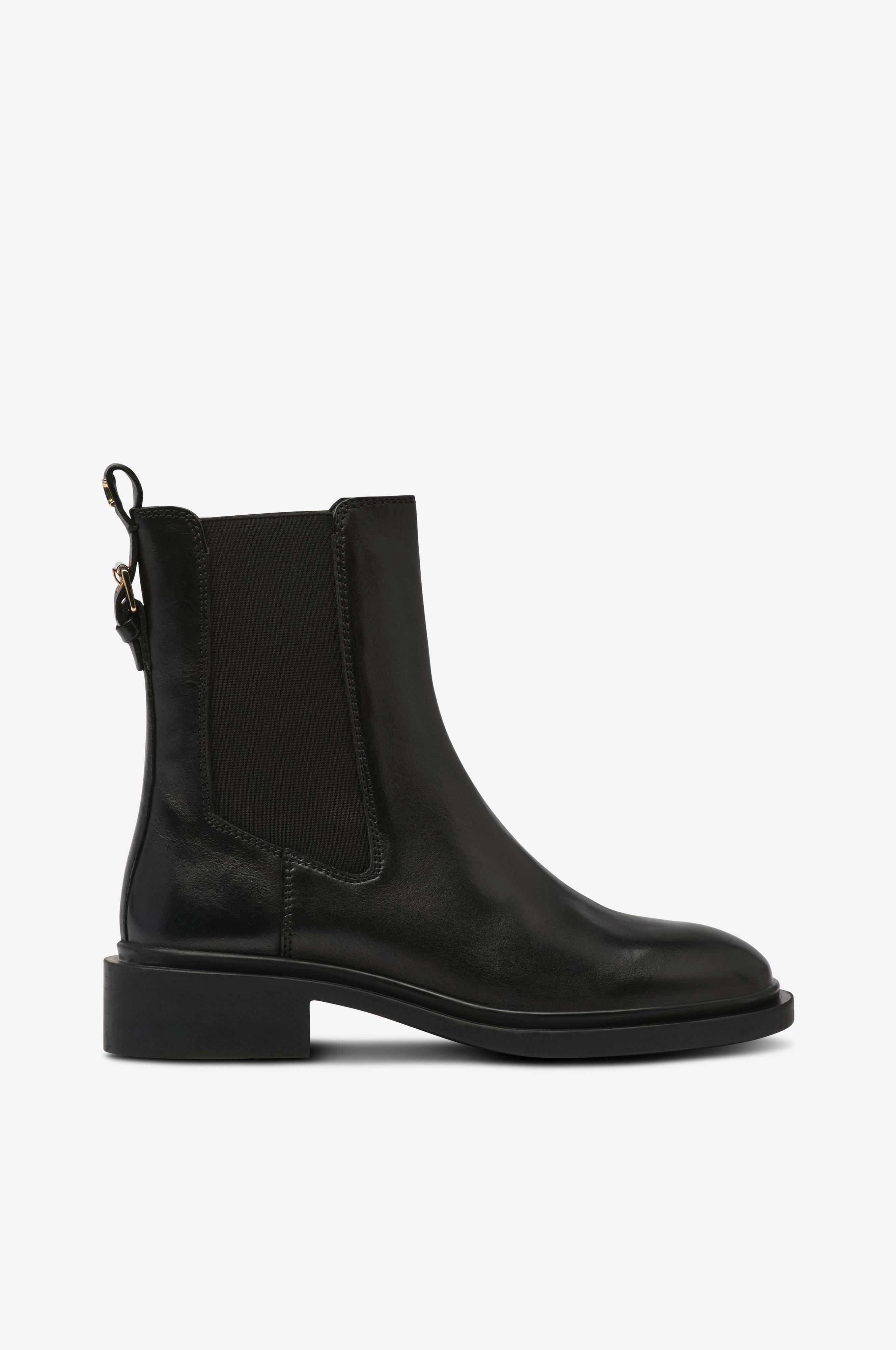 • Boots i læder• Elastiske paneler på begge sider af skaftet• Trækstrop bag på skaftet med dekorativ metallukning• For i læder og tekstil• Ydersål i gummi• Hælhøjde: 3,5 cm• Skafthøjde: 16 cm i str. 37