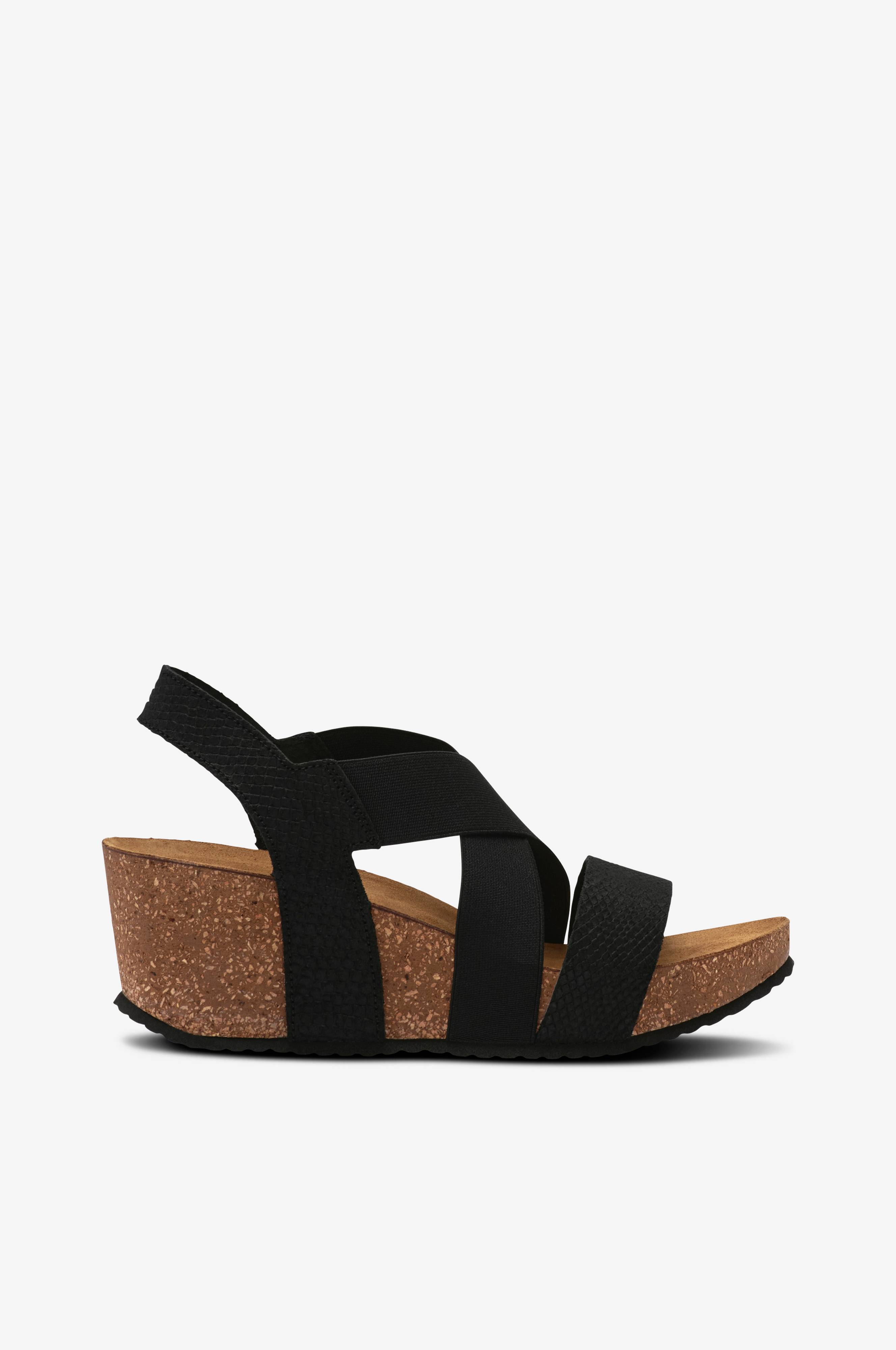 • Remme i slangemønstret læder og elastisk tekstil• Ruskindsklædt fodseng• Korkdækket kilehæl• Hælhøjde: 6,5 cm