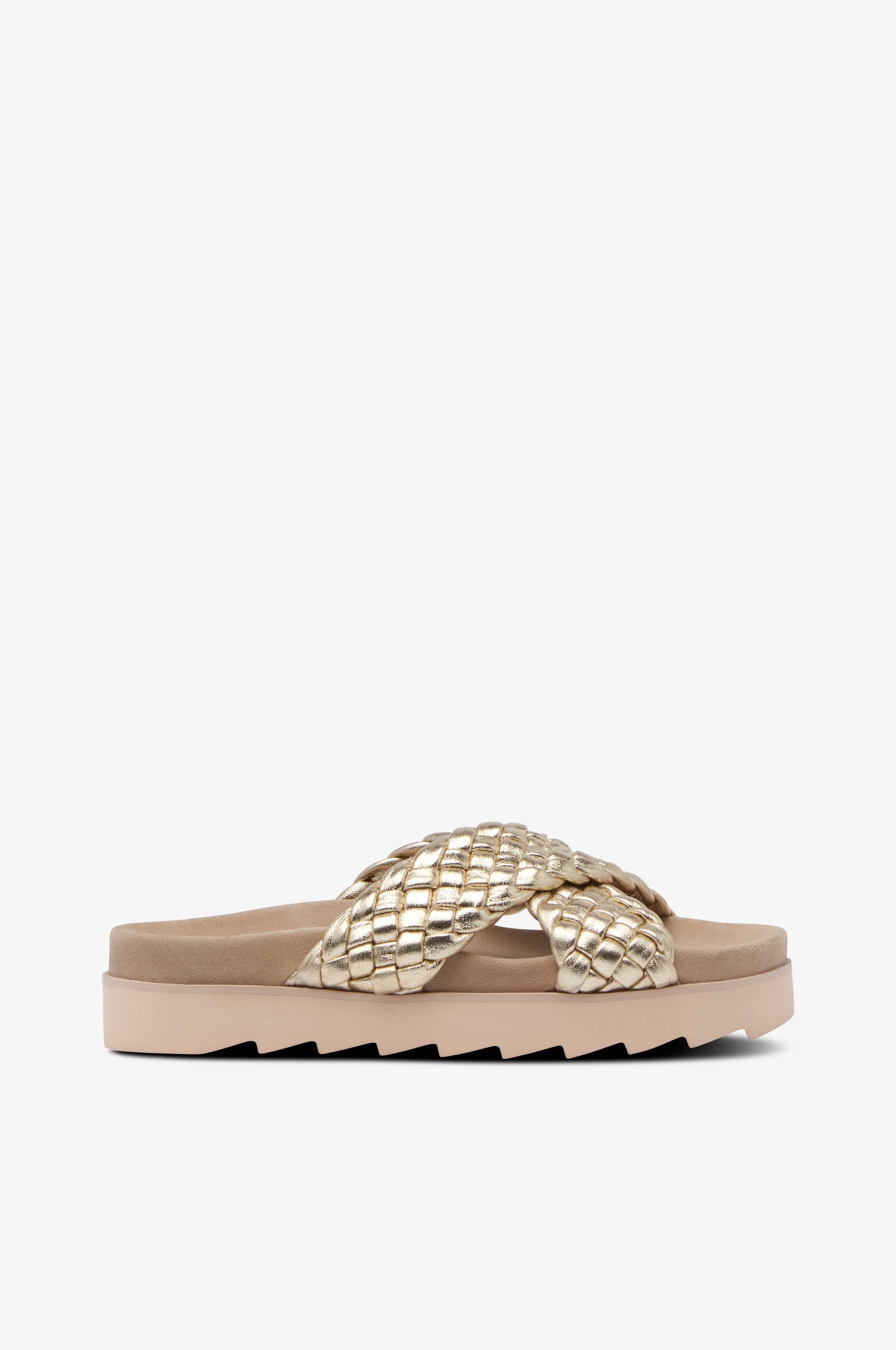 • Guldfarvede remme i flettet læder• Fodseng i ruskind• Sålhøjde: 4 cm