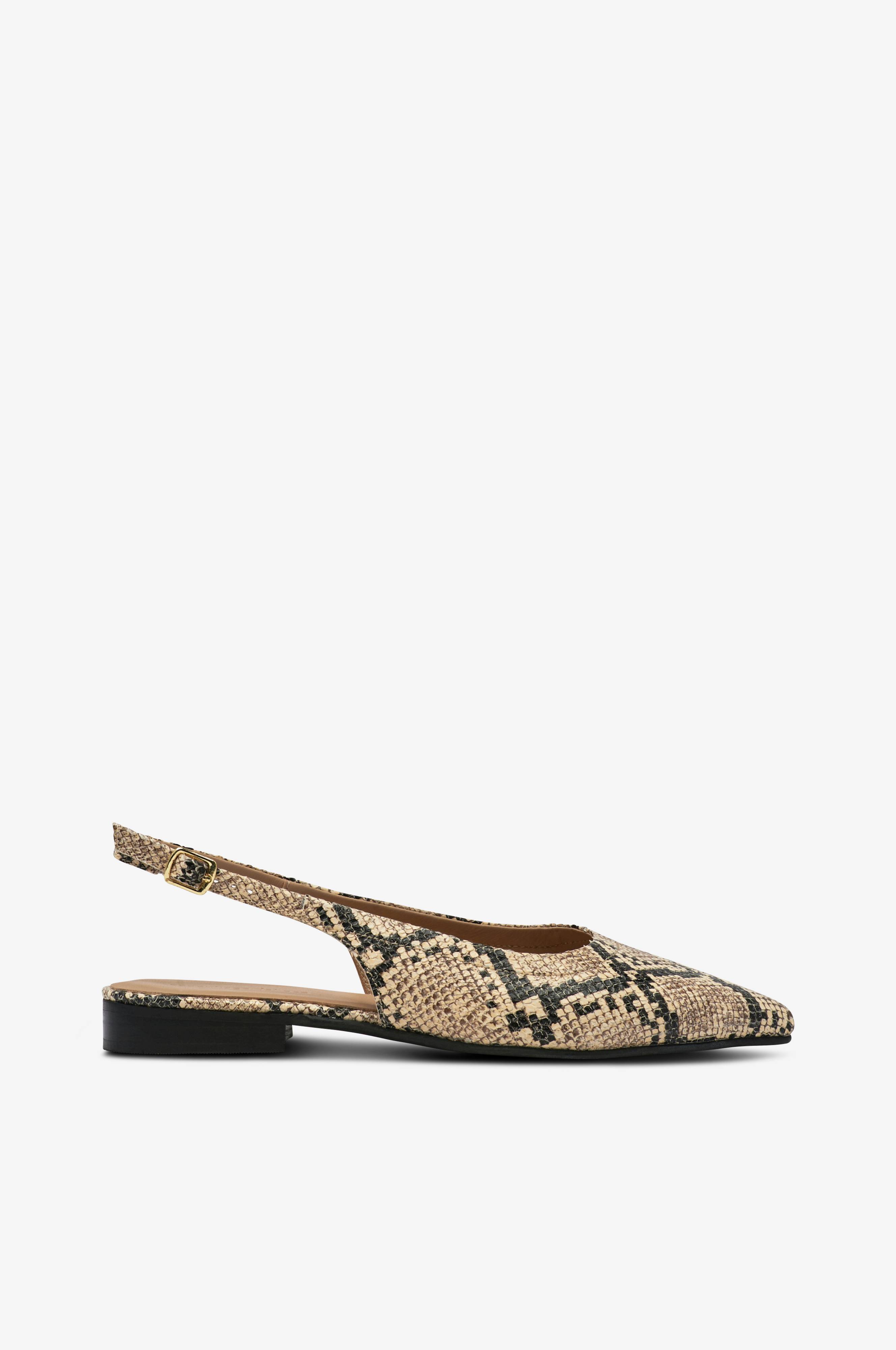 • Slangemønstret slingback i læder• Justérbar hælrem• Læderbetrukket fodseng• Lav hæl