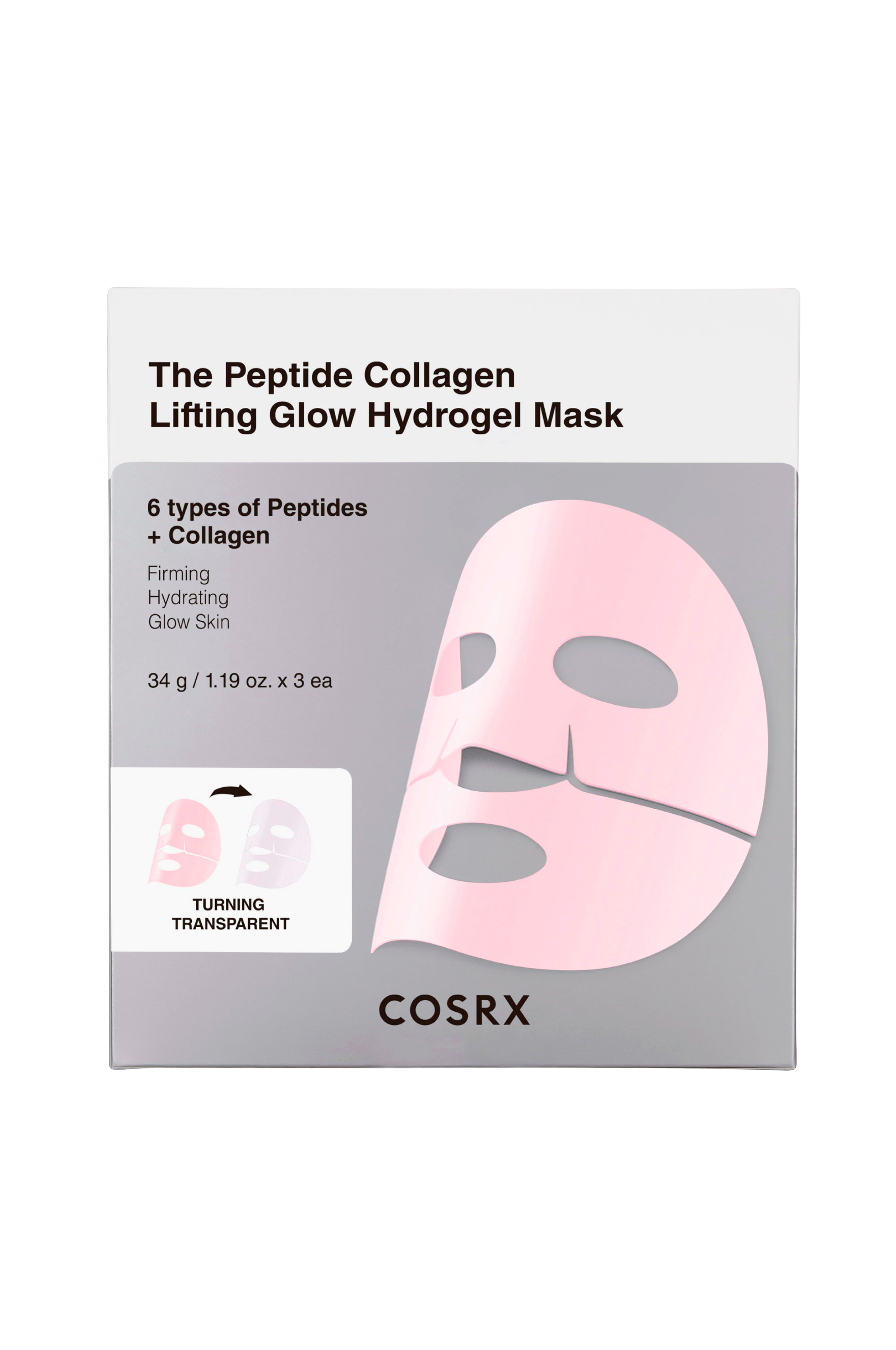 Peptide Collagen Lifting Glow Hydrogel Mask er en innovativ hydrogelmaske tilsat 6 typer peptider og lavmolekylært kollagen, som smelter ind i huden og gradvist bliver gennemsigtig. Den giver en opstrammende og fugtgivende effekt, så huden føles fastere, blødere og mere strålende.