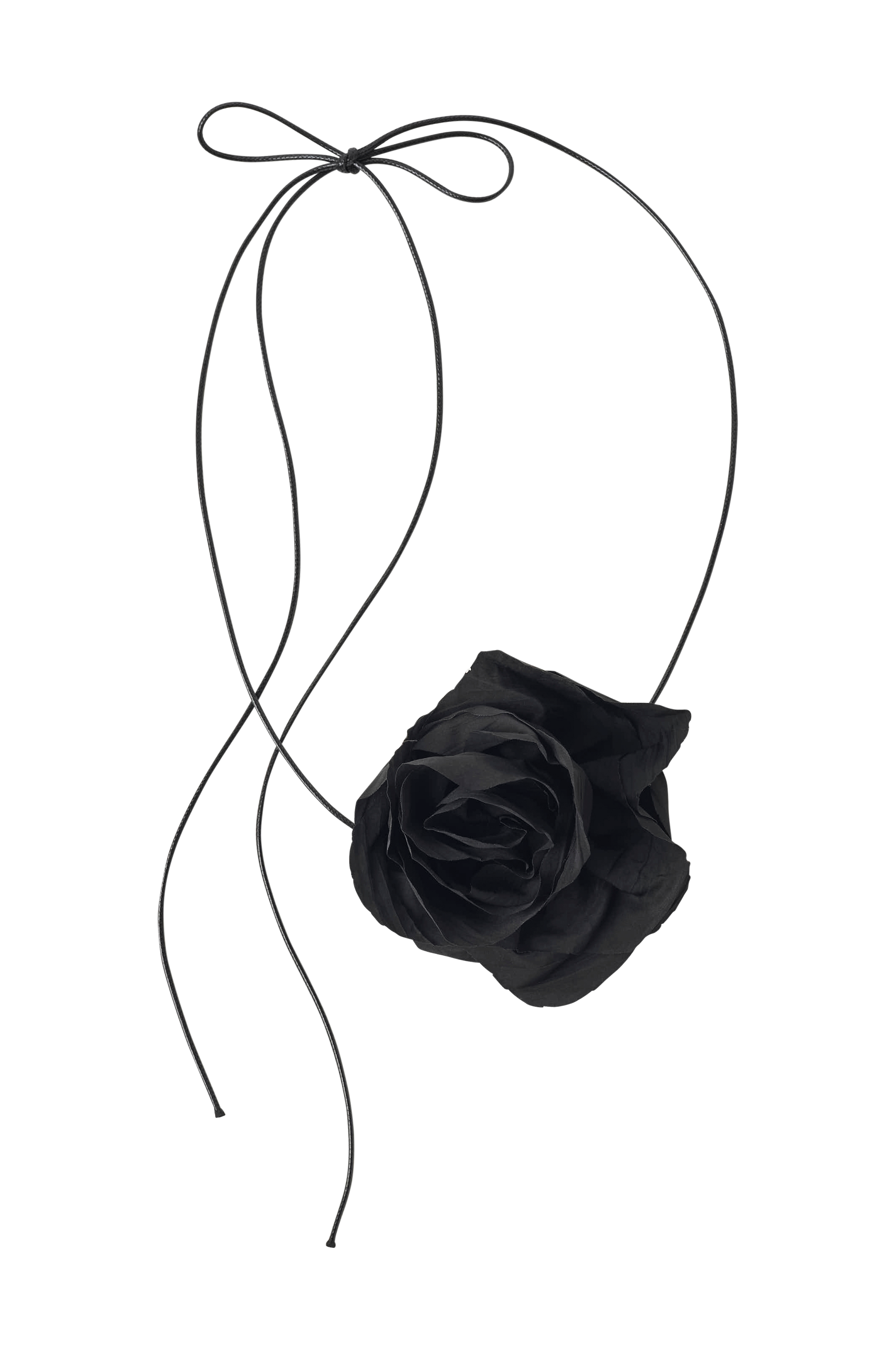 Spænde i form af en smal, lakeret snor med en stor, dekorativ tekstilrose.